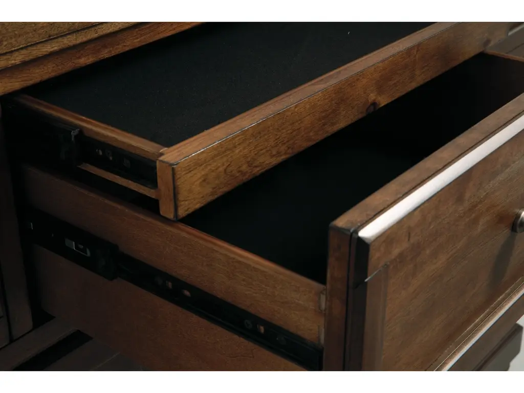 A fresh, new take on traditional style. The Flynnter bedroom set meets today’s design tastes with beauty and grace. The tobacco brown finish allows the natural grain of the acacia veneers to show through in an organic way. Aged brass-tone knobs dress the fronts of the roomy drawers. This is a look you can appreciate for years to come.