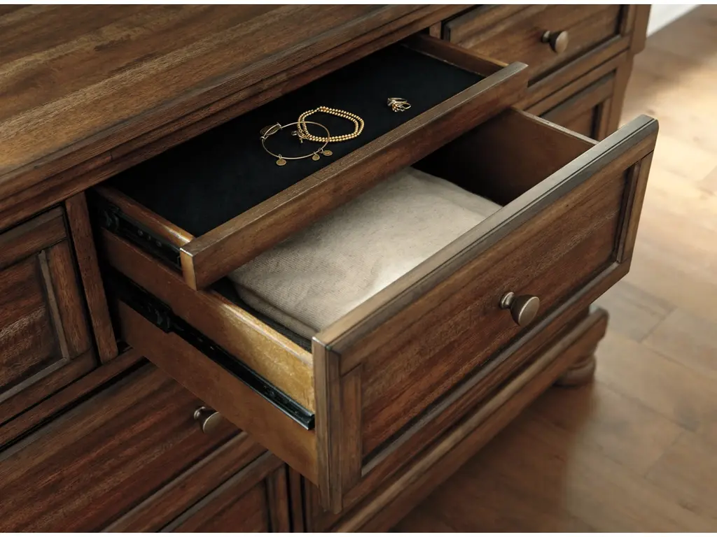 A fresh, new take on traditional style. The Flynnter bedroom set meets today’s design tastes with beauty and grace. The tobacco brown finish allows the natural grain of the acacia veneers to show through in an organic way. Aged brass-tone knobs dress the fronts of the roomy drawers. This is a look you can appreciate for years to come.