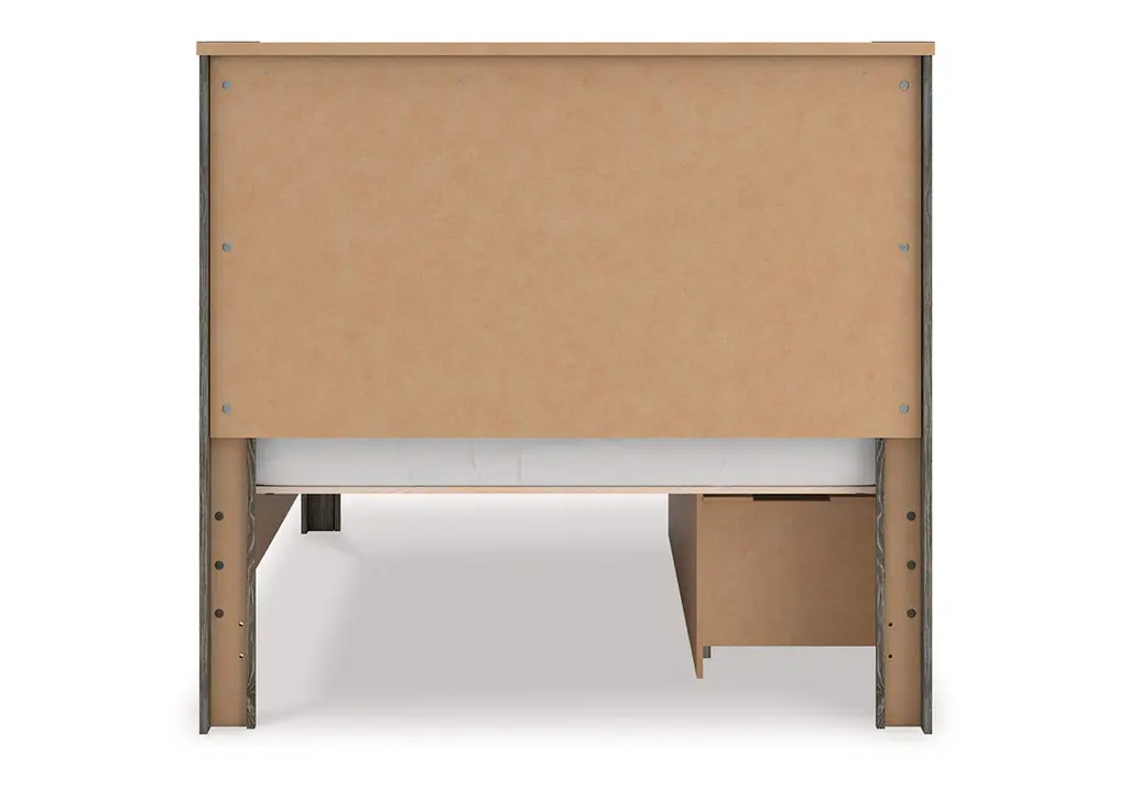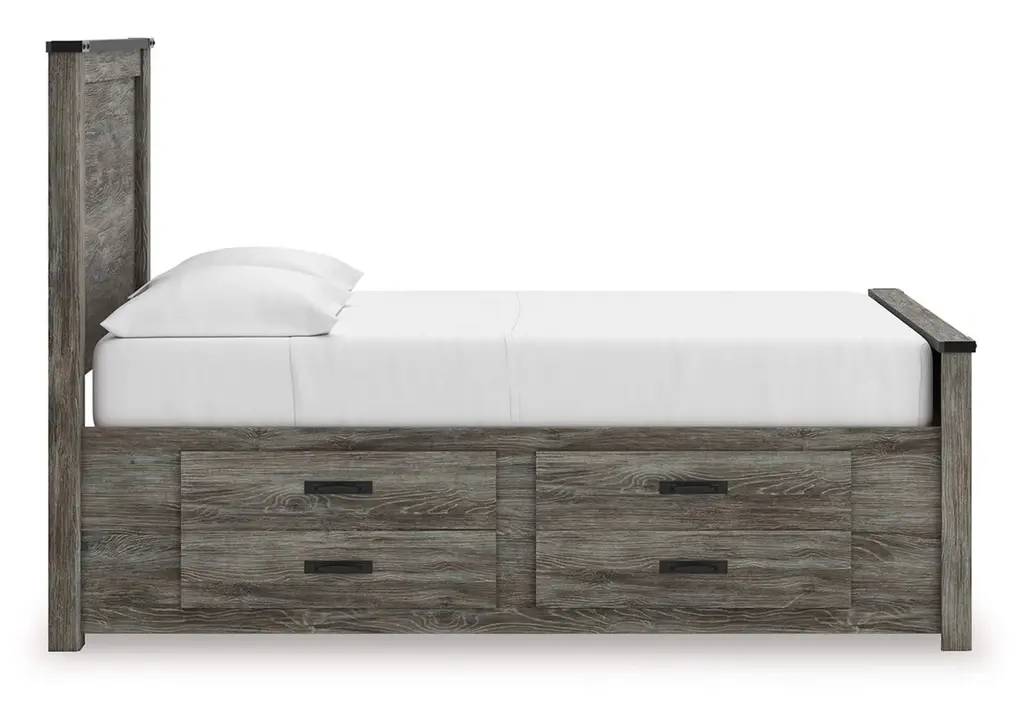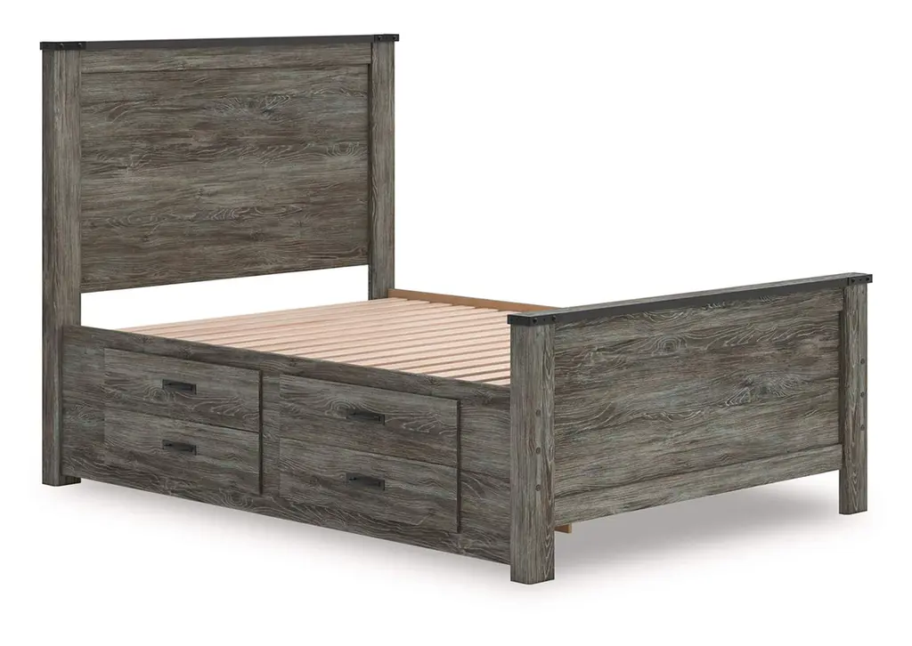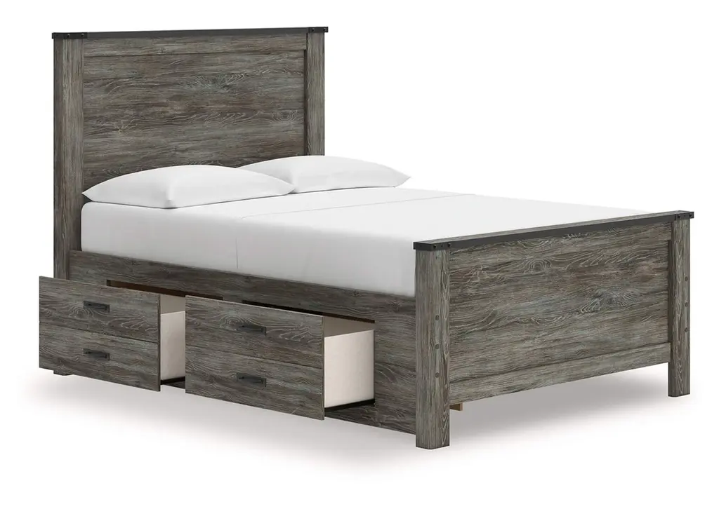 Cool, casual style is for all ages. With the Frandern full panel bed with storage, they get the function they need plus the refined design you love. Approachably neutral in a rustic warm gray, it’s adaptable enough to pair with an assortment of existing colors and room decor. Faux metal detailing with nailhead accents lends an industrial edge. Need more storage space? Drawers under the bed help floors stay clutter-free. Weight 241.000 lbs. (108.45kgs.)