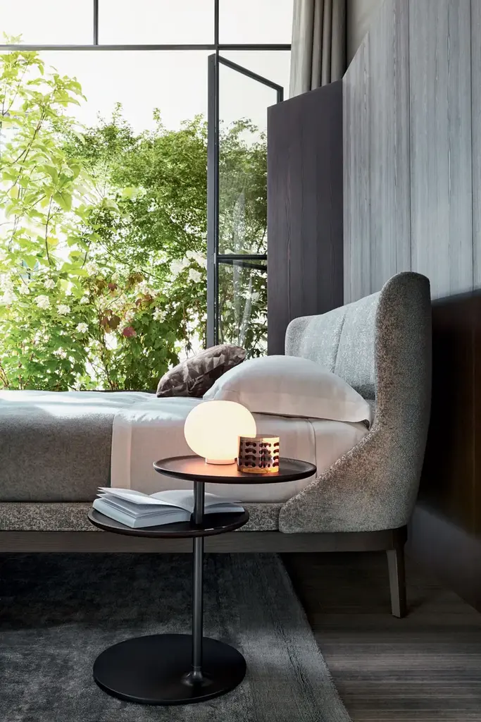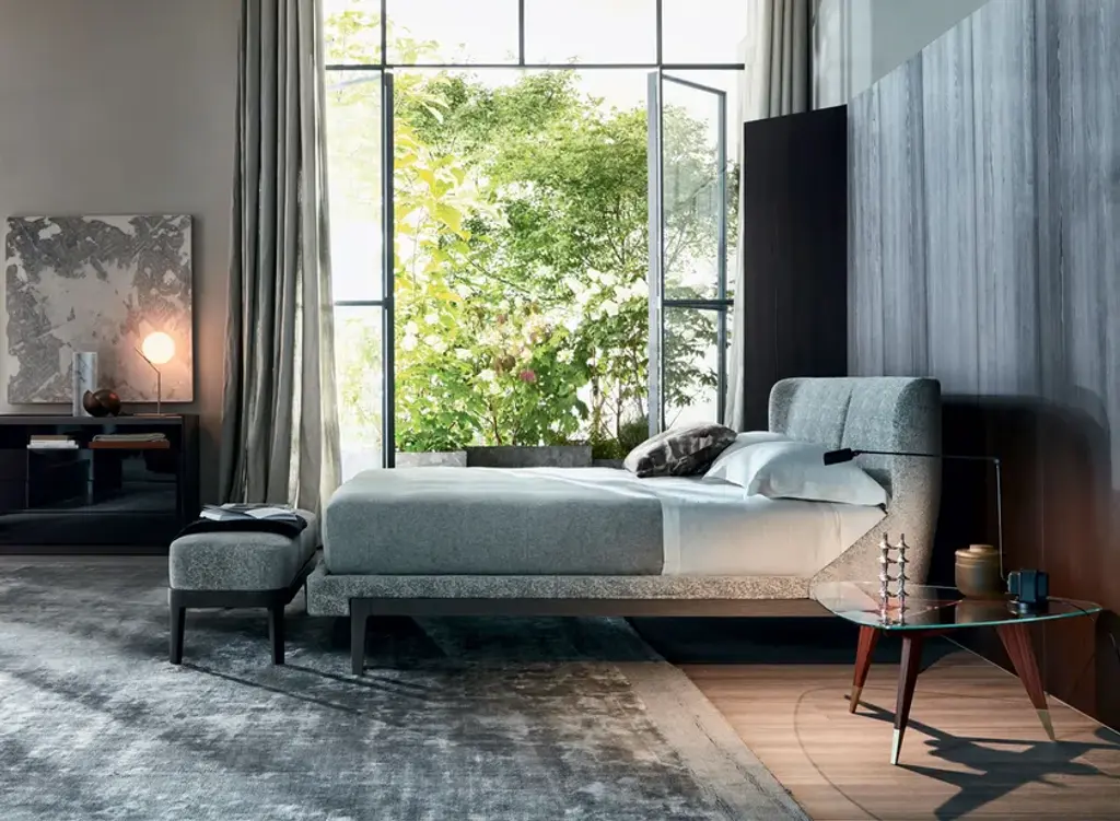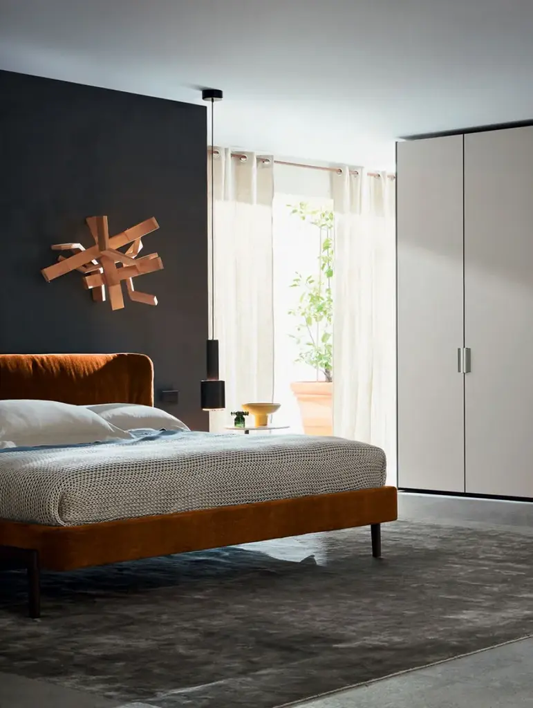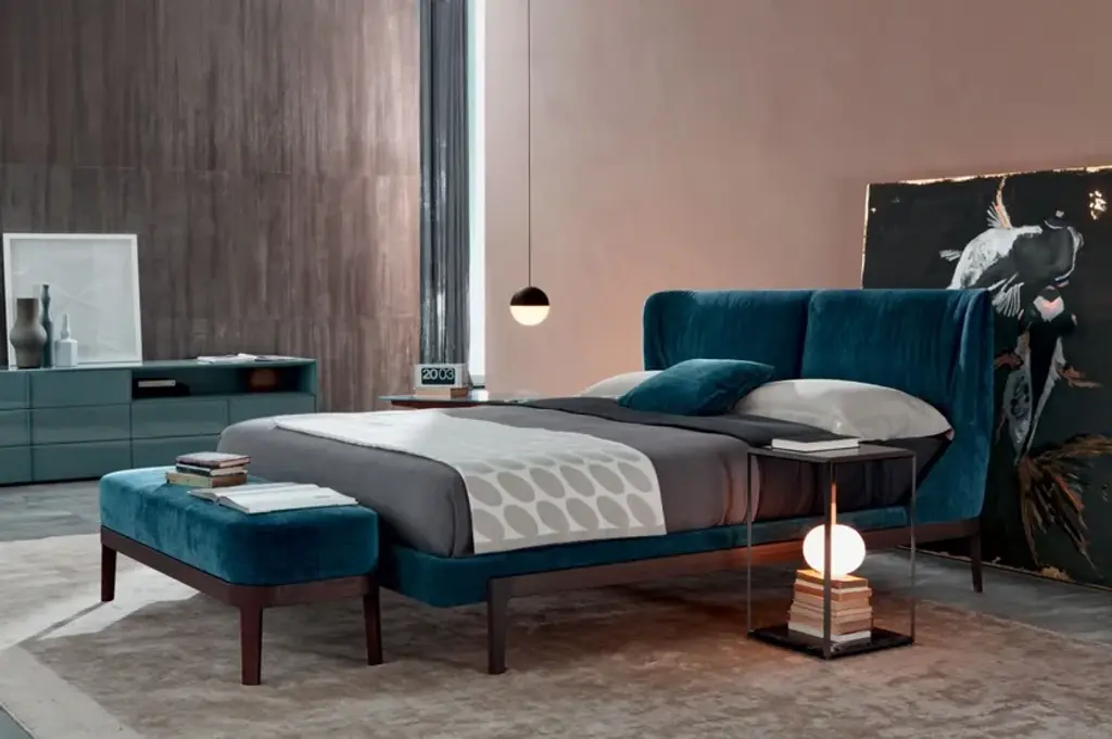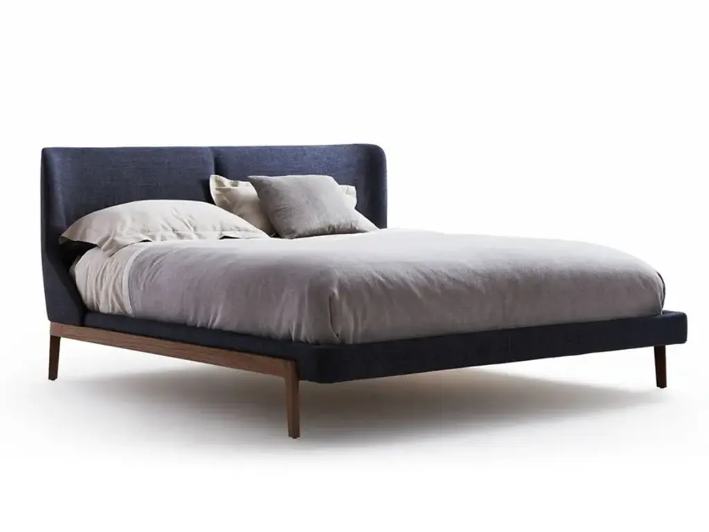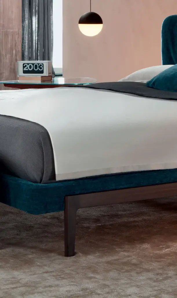 FULHAM is a bed with upholstered headboard. Fulham Road, in the heart of the City of London, gives its name to the bed that the Milanese designer has created for a comfortable and regenerating night’s sleep.The wooden base, available in a range of colors to match any bedroom décor, makes the bed the protagonist of itself. The wrap-around textile or leather headboard provides a cosy and relaxing niche in which to rest, read or watch television. A bench to be placed at the foot of the bed completes the project.