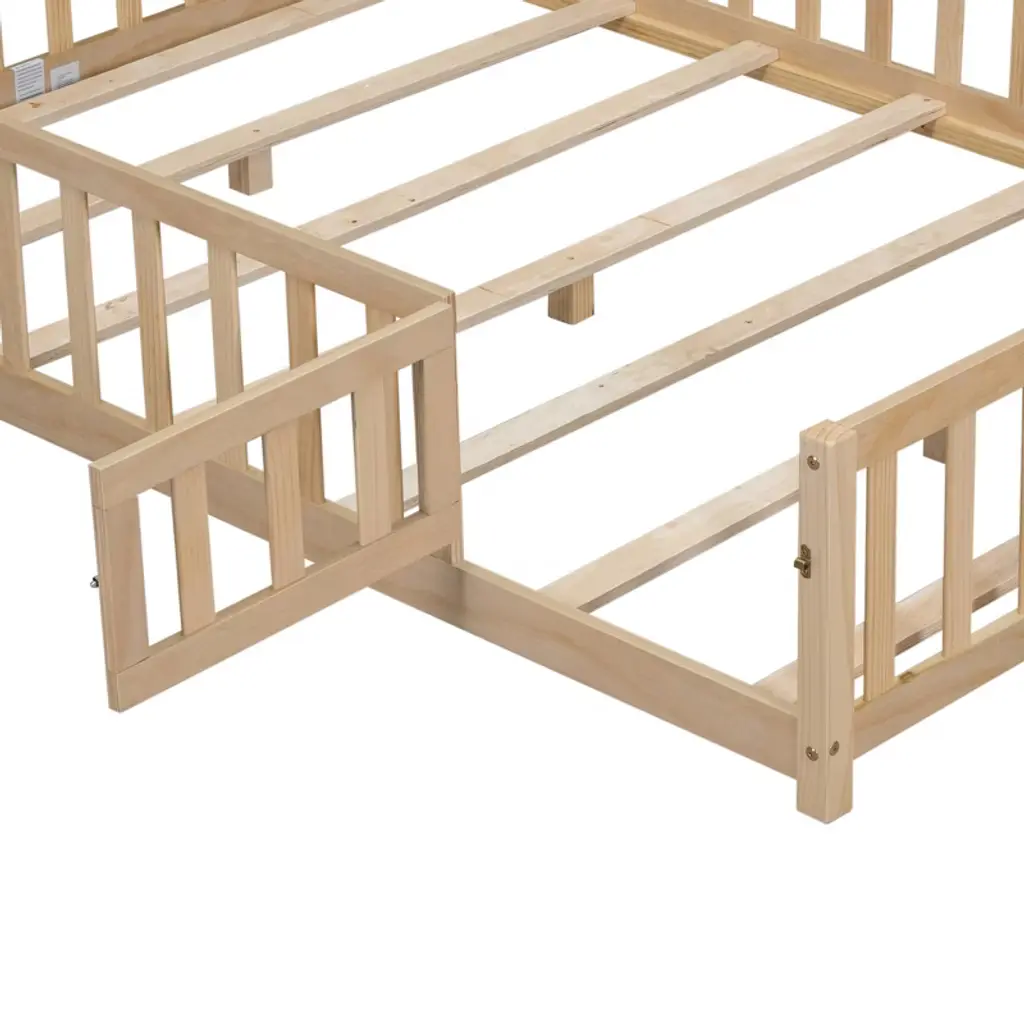 Full Size Floor Platform Bed With Fence And Door For Kids