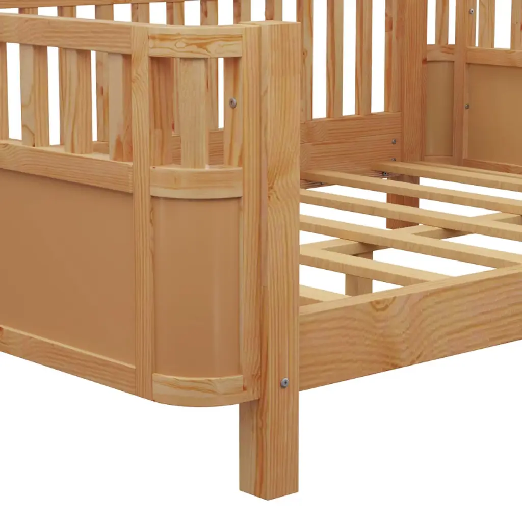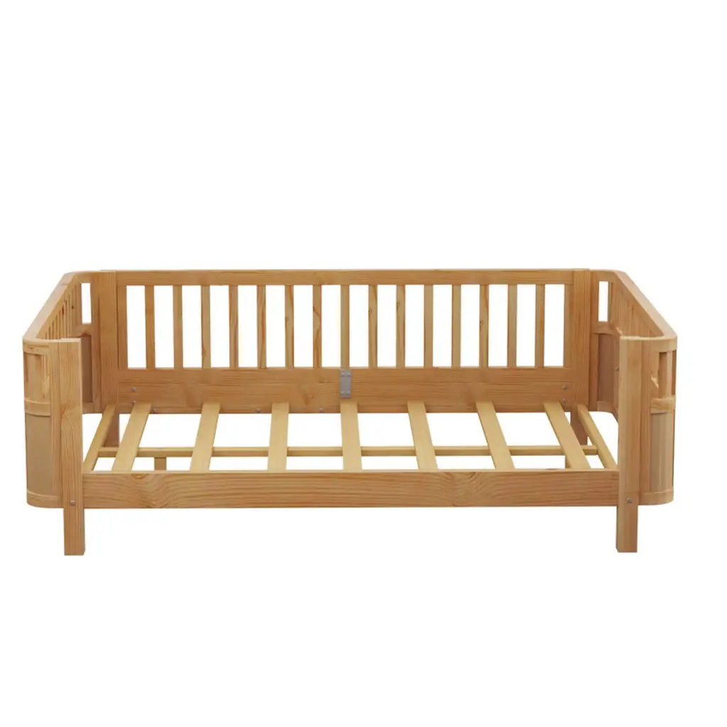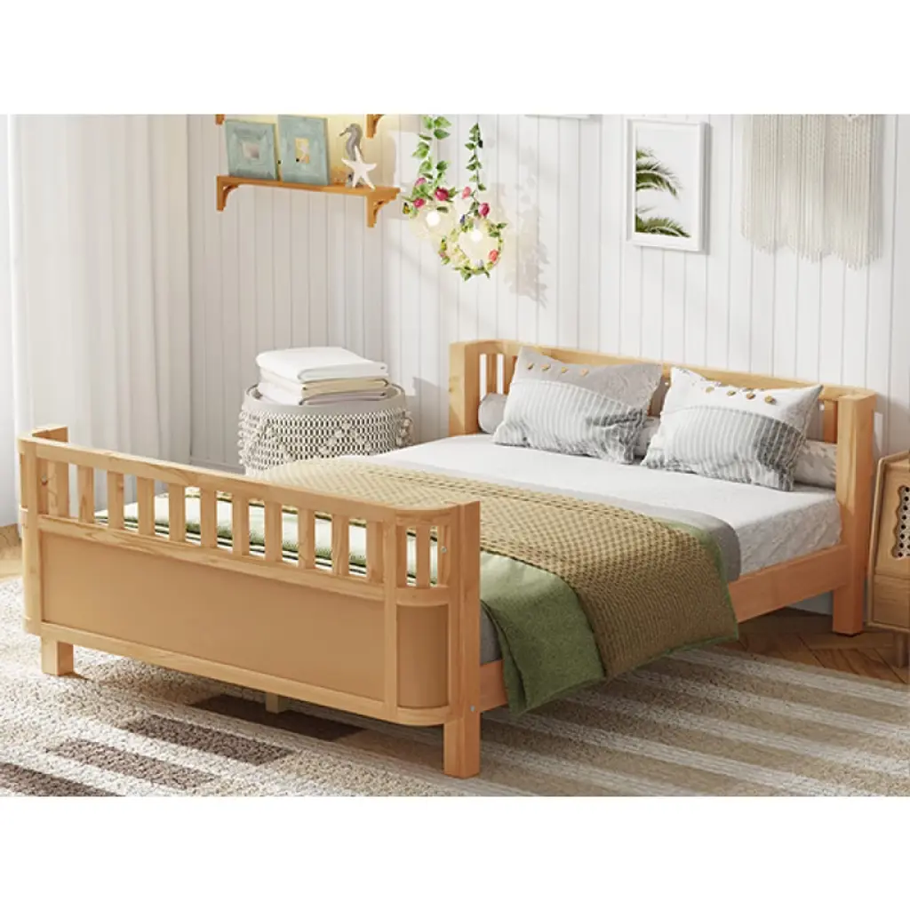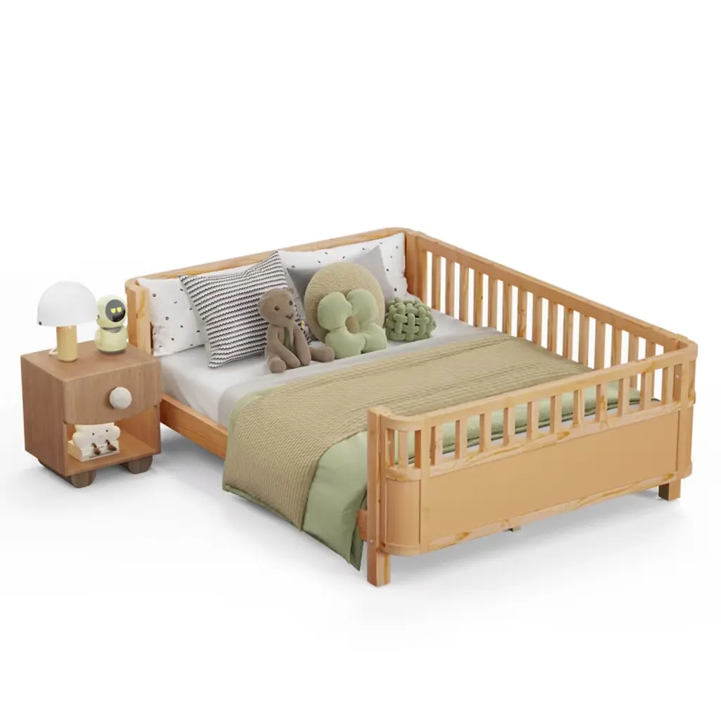 Product Features Low-to-Ground DesignIt is 5.5 inch from the bed frame to the floor. This low design makes the full bed easy for your child to get in and out of, while also enhancing safety.Child-Friendly Safety DesignOur full kids bed is designed with your children's safety in mind. The 4 corners of the bed are rounded, and the legs are placed inward to help avoid bumps and protect your child's feet.Versatile Usage OptionsThis kids bed offers multiple uses: place the side without rails against the wall for little kids, use it as a daybed, or position it next to a parent's bed for easier nighttime care. Plus, the right side rail can be removed when not needed — a flexible design that meets your growing child’s changing needs.Increased Safety with Thoughtful Fence DesignThis full platform bed features a fence with a headboard, footboard, and sides to enhance safety. With a 2.8 inch gap in each fence, it effectively prevents pinch hazards.Durable and Sturdy ConstructionCrafted with a sturdy wooden frame made from a combination of solid wood, plywood, and MDF, this kids full bed is both durable and safe. Its modern and elegant design blends seamlessly with a variety of room themes and color schemes, making it a delightful addition to any boy's or girl's room. Description This kids bed is designed with guardrails to provide a safe sleeping environment. Constructed from solid pine wood and MDF, it features a high-quality solid wood construction that ensures durability and high load capacity for long-lasting use. Description & Dimensions Size: FullProduct Weight: N.W: 61.73 LBS / G.W: 70.54 LBSWeight Capacity: 350 LBSRecommended Mattress Thickness: 6–8 inchNumber of Slats: 9 pcsNumber of Packages: 1Box Spring Required: NoRemark: Different lighting or display settings may cause slight color differences.