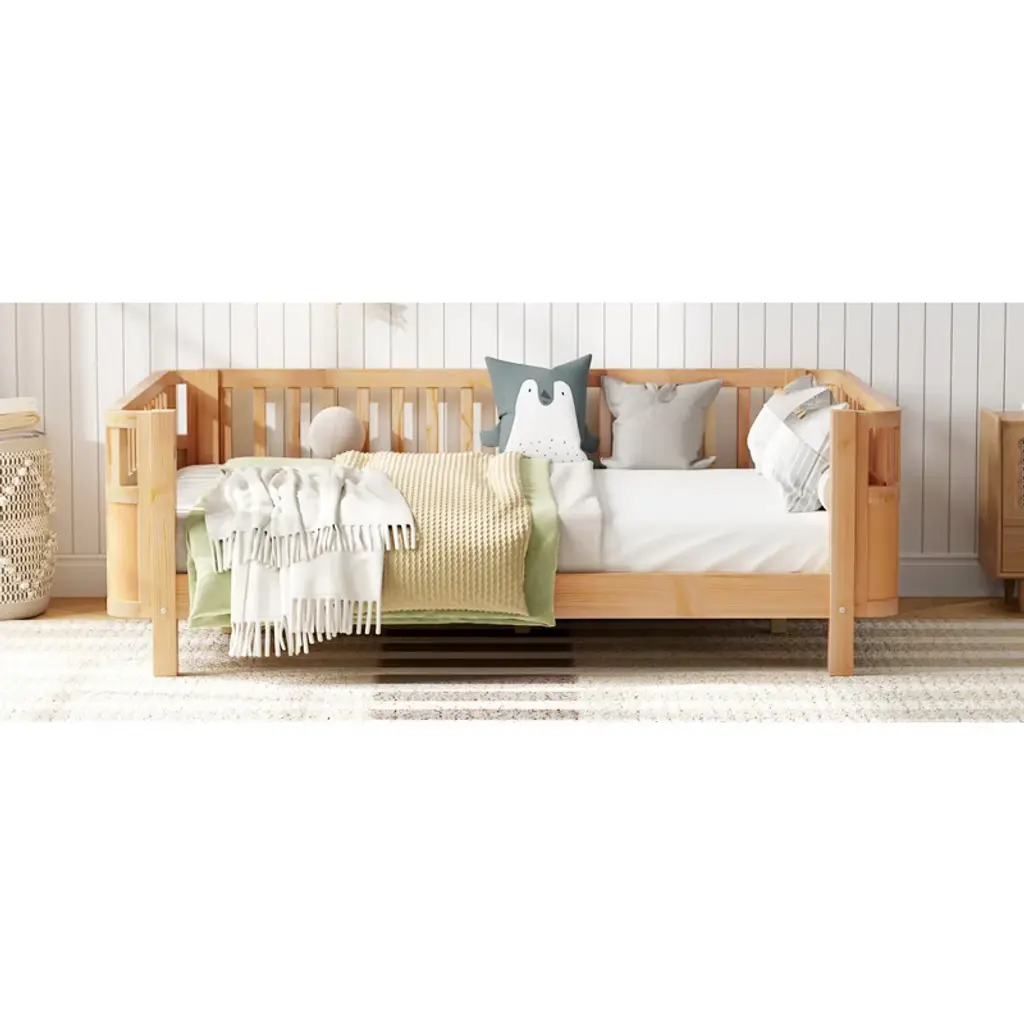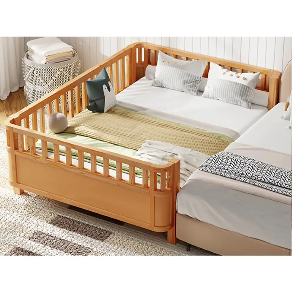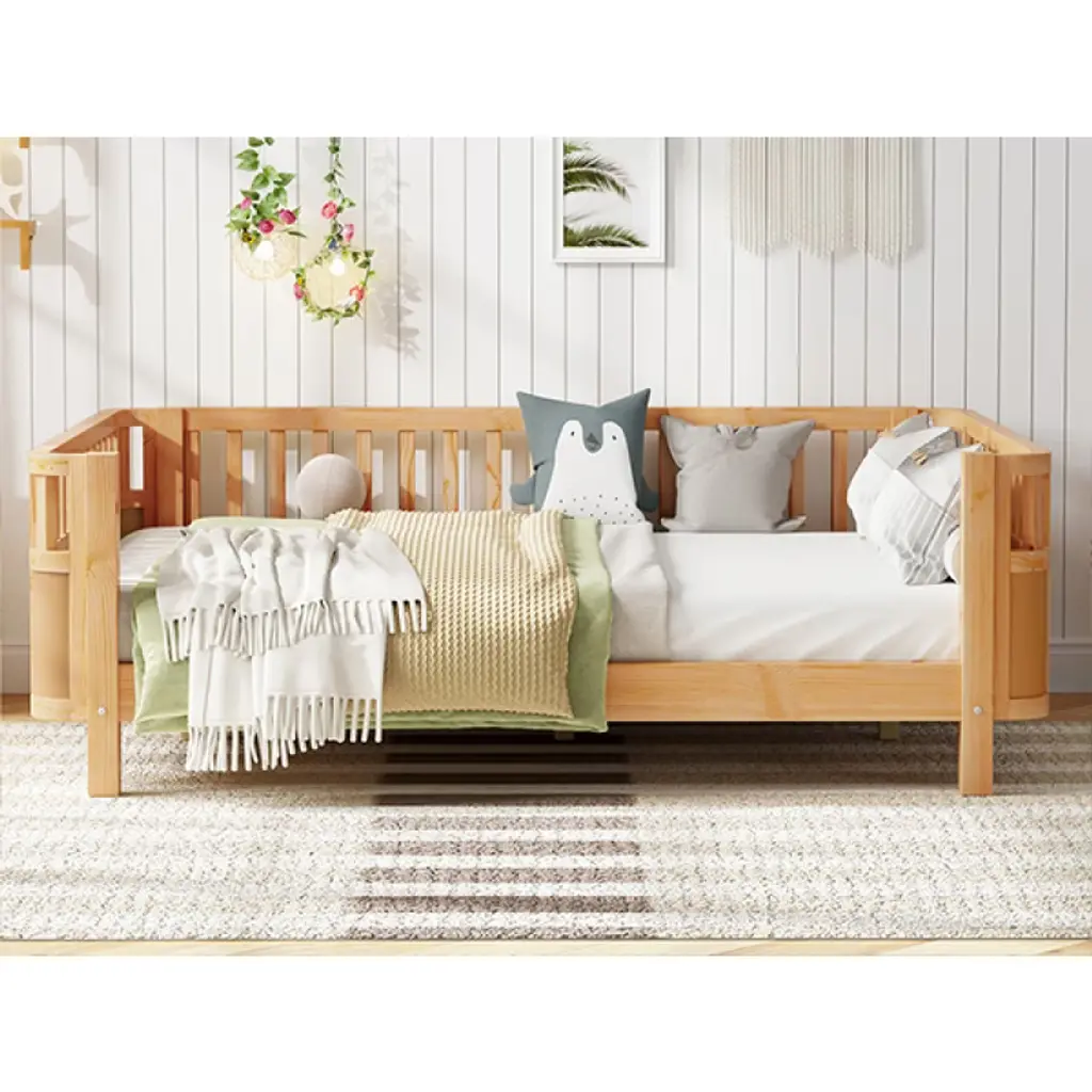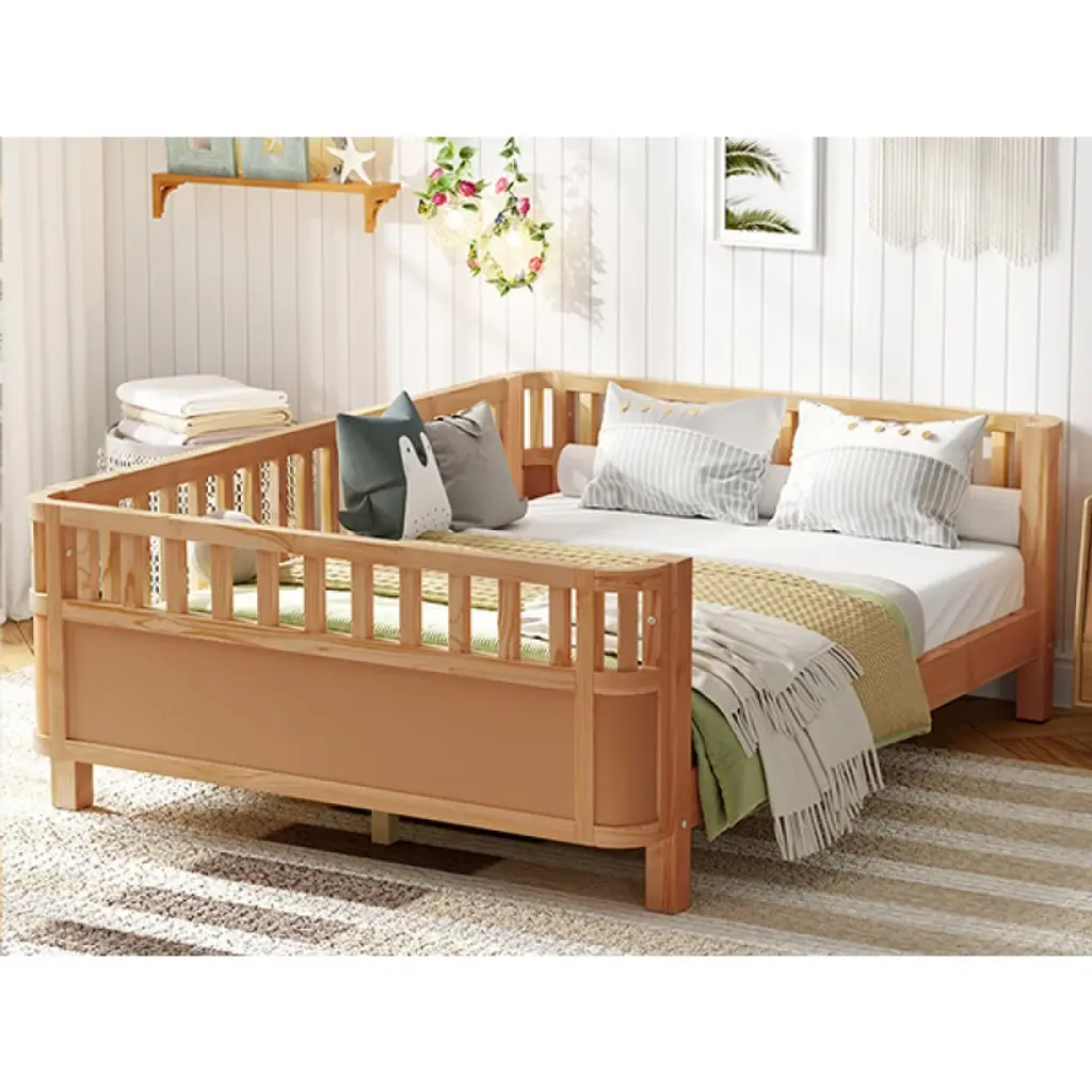 Product Features Low-to-Ground DesignIt is 5.5 inch from the bed frame to the floor. This low design makes the full bed easy for your child to get in and out of, while also enhancing safety.Child-Friendly Safety DesignOur full kids bed is designed with your children's safety in mind. The 4 corners of the bed are rounded, and the legs are placed inward to help avoid bumps and protect your child's feet.Versatile Usage OptionsThis kids bed offers multiple uses: place the side without rails against the wall for little kids, use it as a daybed, or position it next to a parent's bed for easier nighttime care. Plus, the right side rail can be removed when not needed — a flexible design that meets your growing child’s changing needs.Increased Safety with Thoughtful Fence DesignThis full platform bed features a fence with a headboard, footboard, and sides to enhance safety. With a 2.8 inch gap in each fence, it effectively prevents pinch hazards.Durable and Sturdy ConstructionCrafted with a sturdy wooden frame made from a combination of solid wood, plywood, and MDF, this kids full bed is both durable and safe. Its modern and elegant design blends seamlessly with a variety of room themes and color schemes, making it a delightful addition to any boy's or girl's room. Description This kids bed is designed with guardrails to provide a safe sleeping environment. Constructed from solid pine wood and MDF, it features a high-quality solid wood construction that ensures durability and high load capacity for long-lasting use. Description & Dimensions Size: FullProduct Weight: N.W: 61.73 LBS / G.W: 70.54 LBSWeight Capacity: 350 LBSRecommended Mattress Thickness: 6–8 inchNumber of Slats: 9 pcsNumber of Packages: 1Box Spring Required: NoRemark: Different lighting or display settings may cause slight color differences.