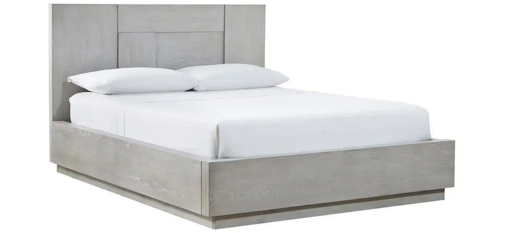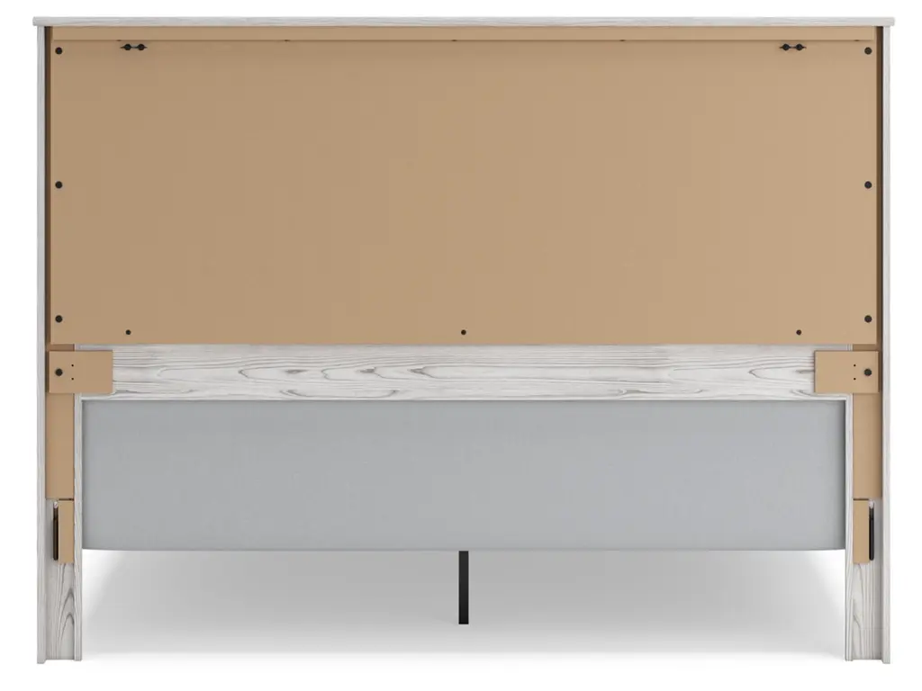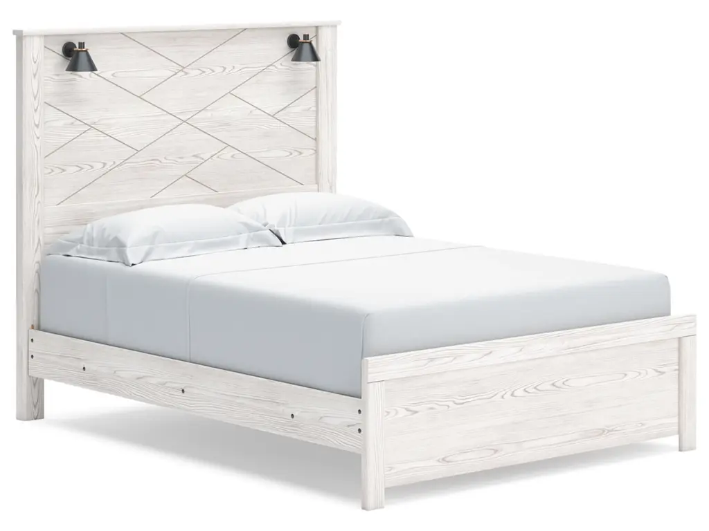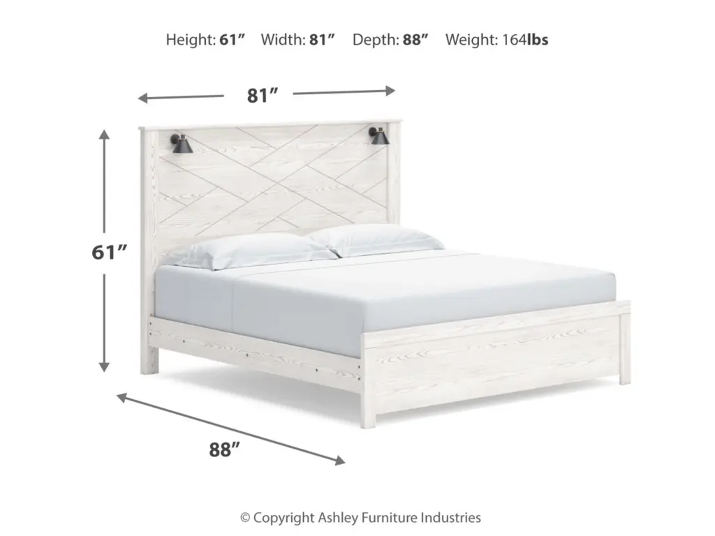 Cool, clean and casually modern. The Gerridan king panel bed’s white rustic finish sets the tone for your calming sanctuary. Matte black sconce lights and an abstract design on the headboard bring a fresh look to the bed’s simply stunning profile.