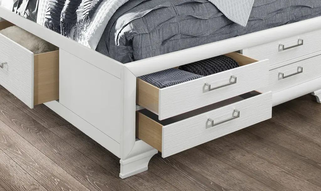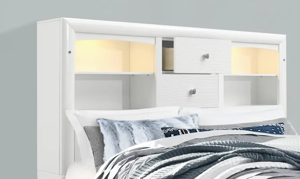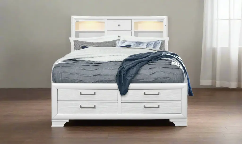 The Global Furniture Jordyn Platform Bed is designed to offer both style and functionality for your bedroom. This bed features a platform design, eliminating the need for a box spring and allowing for additional storage space. The headboard includes built-in lighting and two storage drawers, providing both convenience and extra storage. The bed is available in white and gray finishes, each with a lacquered surface and nickel hardware for a clean, modern look. Under the bed, you will find drawers for additional storage, and the footboard also includes storage options, making it practical for keeping your bedroom organized.