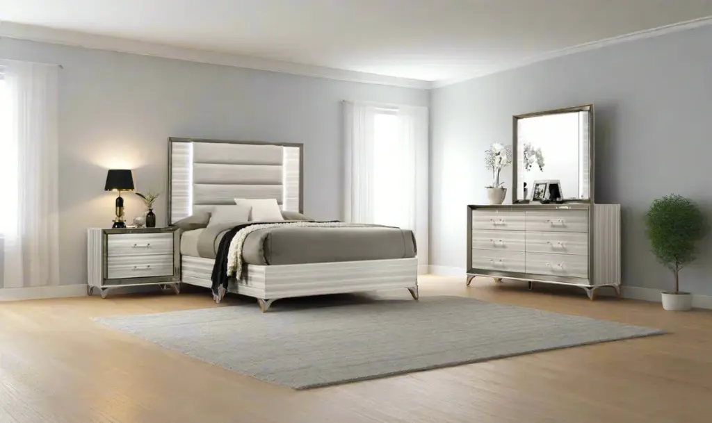 The Global Furniture Zambrano White Bedroom Set offers a blend of modern design and practical functionality, making it a sophisticated addition to any bedroom. The collection is defined by its sleek lines and a pristine white finish that brightens the space, while polished chrome accents add a touch of understated luxury. Each piece in the set is designed to create a cohesive, elegant atmosphere, perfect for those who appreciate contemporary style. One of the standout features of the Zambrano collection is the built-in LED lighting, which not only enhances the room's ambiance but also adds a functional element, providing subtle illumination. The set also offers ample storage options, making it as practical as it is stylish. Whether you're looking to create a serene retreat or a chic, modern bedroom, the Zambrano collection provides a versatile solution that suits various needs. Note: This Set is available in the following configurations: Bed + Dresser + Mirror + Nightstand Bed + Dresser + Mirror + 2 Nightstands Bed + Dresser + Mirror + Nightstand + Chest Bed + Dresser + Mirror + 2 Nightstands + Chest