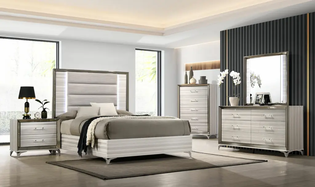 The Global Furniture Zambrano White Bedroom Set offers a blend of modern design and practical functionality, making it a sophisticated addition to any bedroom. The collection is defined by its sleek lines and a pristine white finish that brightens the space, while polished chrome accents add a touch of understated luxury. Each piece in the set is designed to create a cohesive, elegant atmosphere, perfect for those who appreciate contemporary style. One of the standout features of the Zambrano collection is the built-in LED lighting, which not only enhances the room's ambiance but also adds a functional element, providing subtle illumination. The set also offers ample storage options, making it as practical as it is stylish. Whether you're looking to create a serene retreat or a chic, modern bedroom, the Zambrano collection provides a versatile solution that suits various needs. Note: This Set is available in the following configurations: Bed + Dresser + Mirror + Nightstand Bed + Dresser + Mirror + 2 Nightstands Bed + Dresser + Mirror + Nightstand + Chest Bed + Dresser + Mirror + 2 Nightstands + Chest
