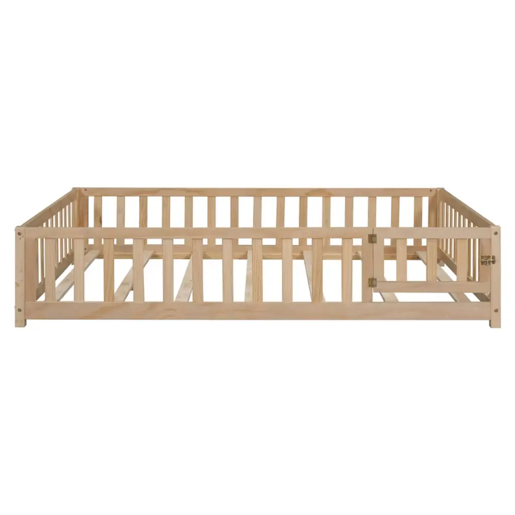 Gulches Full Size Floor Platform Bed With Fence And Door For Kids, Montessori Floor Bed Frame With Support Slats For Toddlers, Wooden Floor Bed Grey