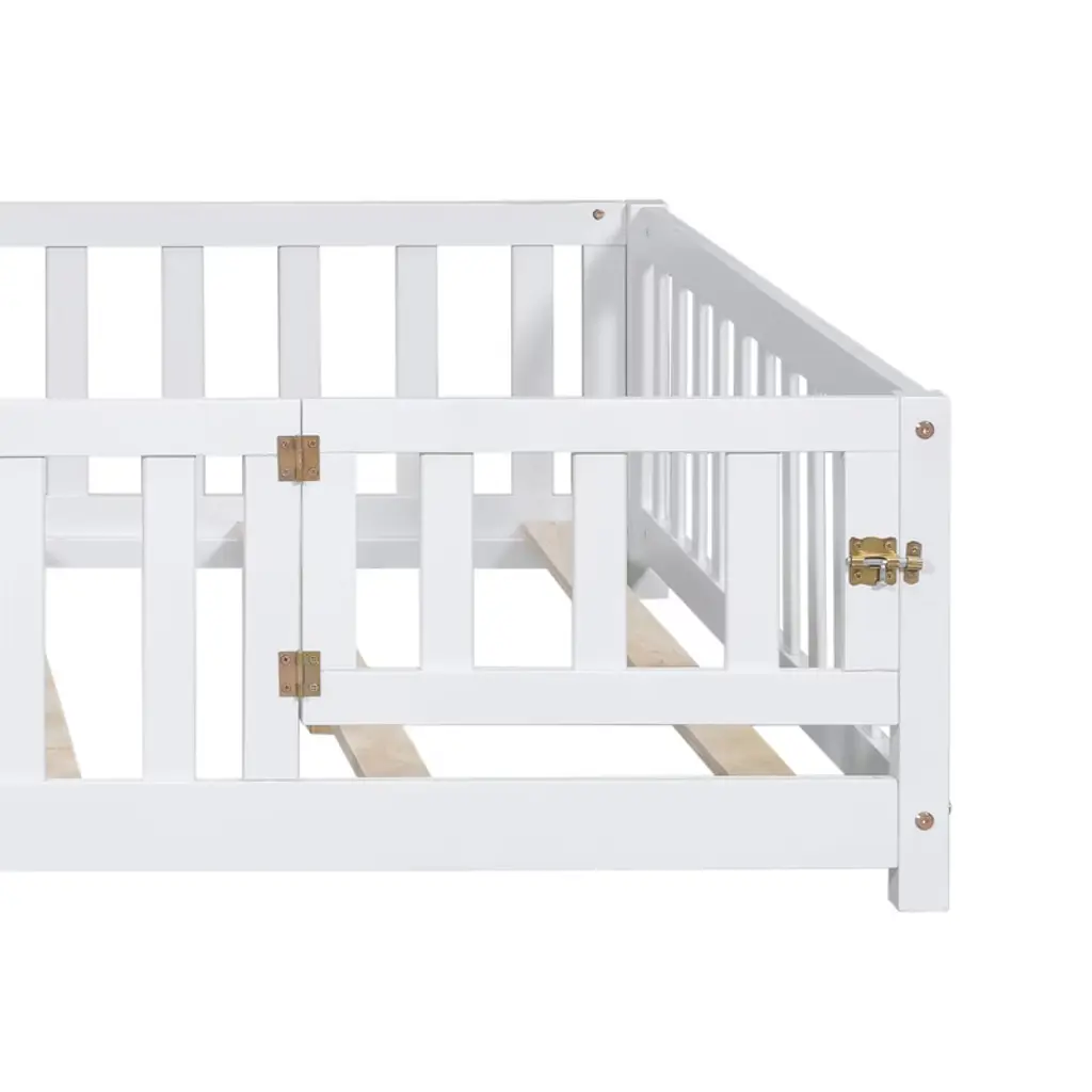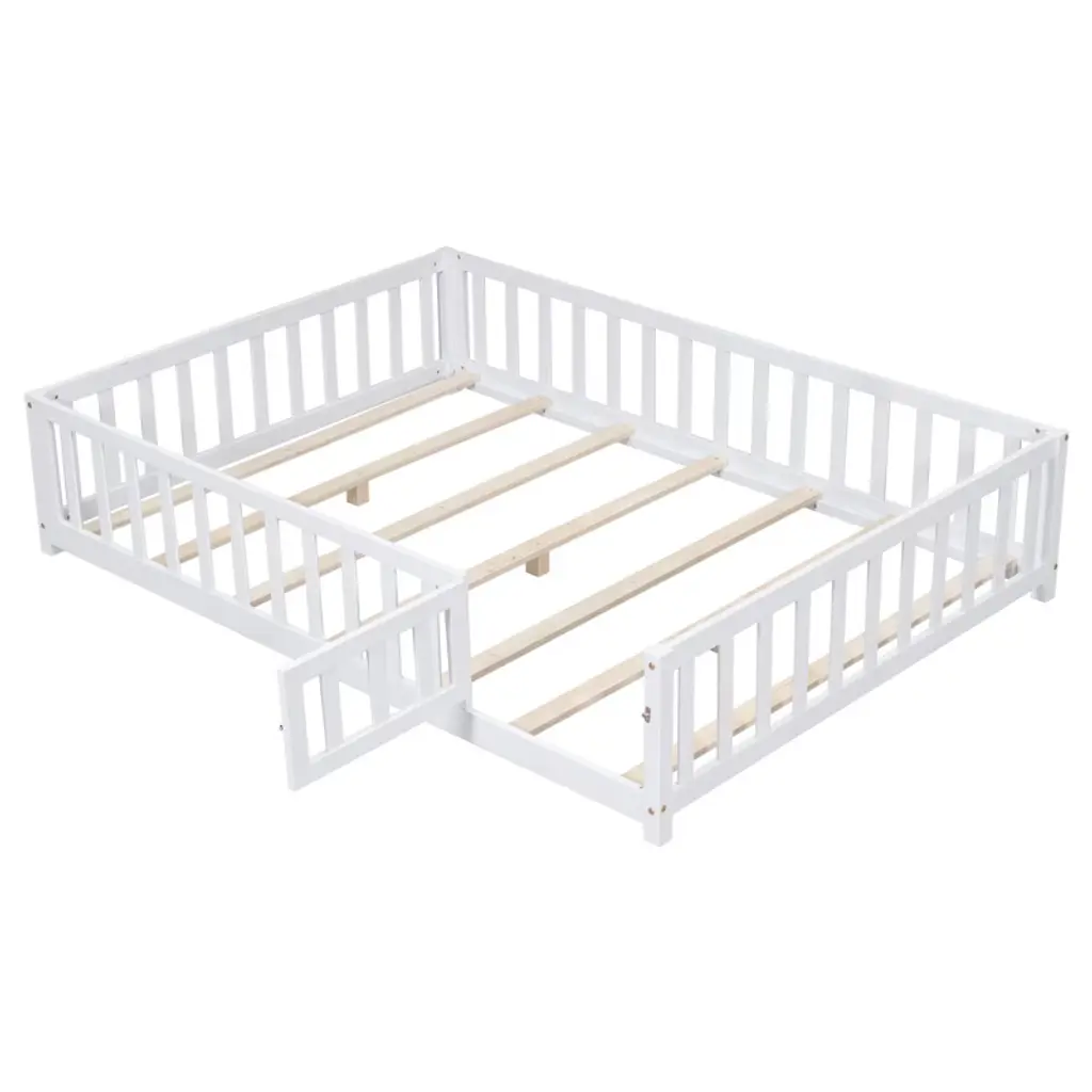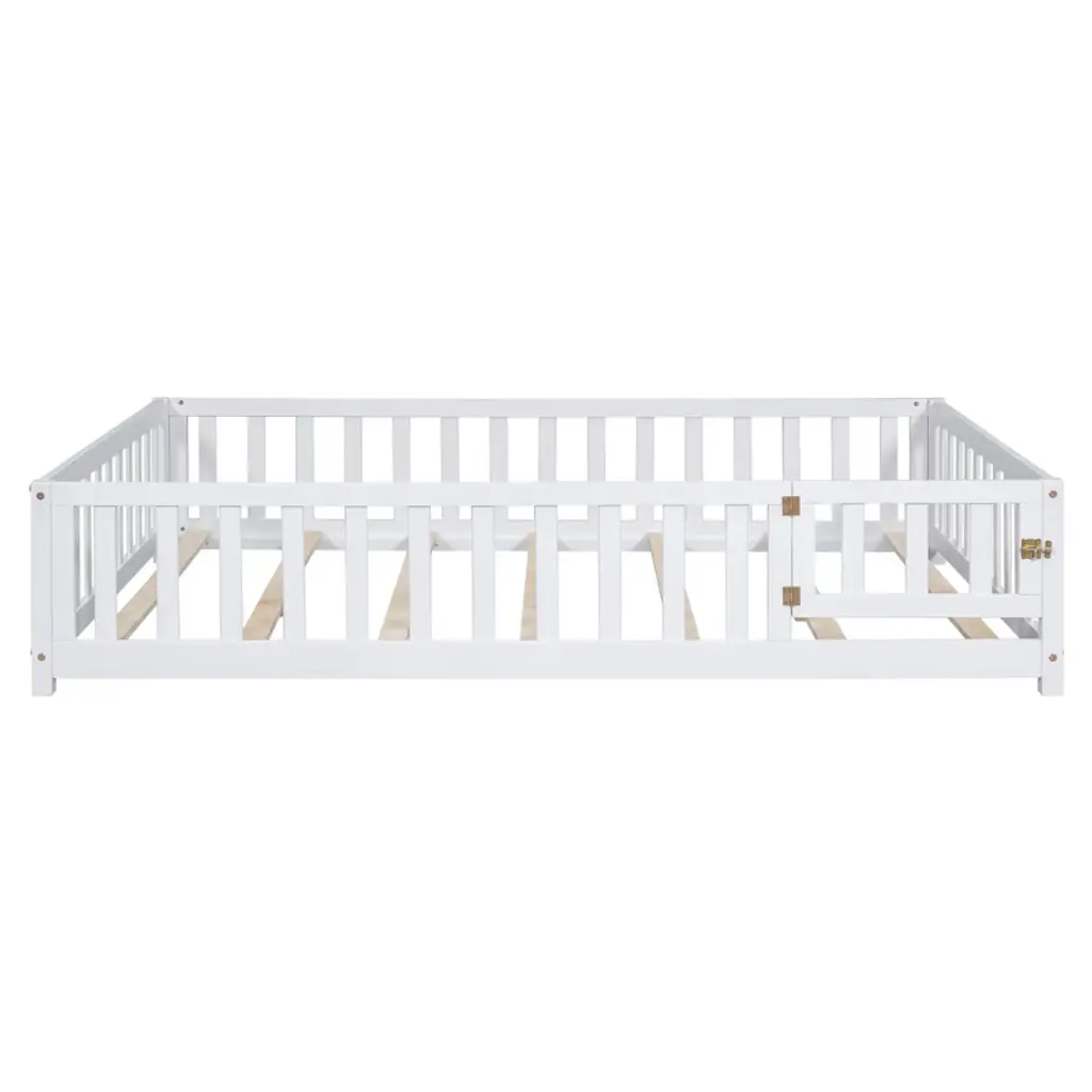 Gulches Full Size Floor Platform Bed With Fence And Door For Kids, Montessori Floor Bed Frame With Support Slats For Toddlers, Wooden Floor Bed Grey