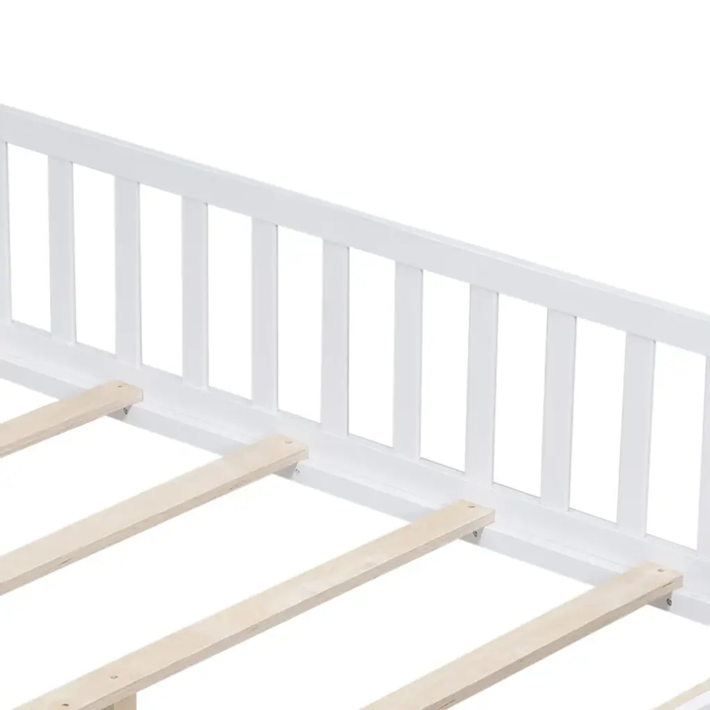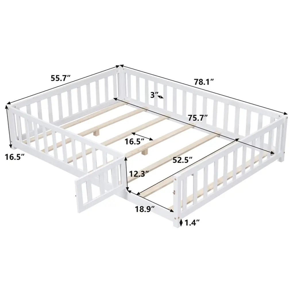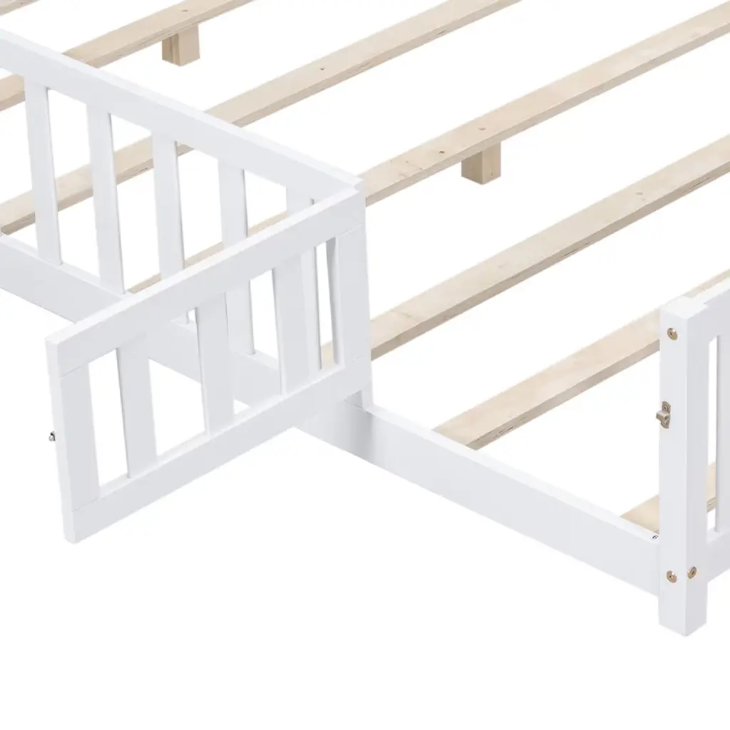 Gulches Full Size Floor Platform Bed With Fence And Door For Kids, Montessori Floor Bed Frame With Support Slats For Toddlers, Wooden Floor Bed Grey
