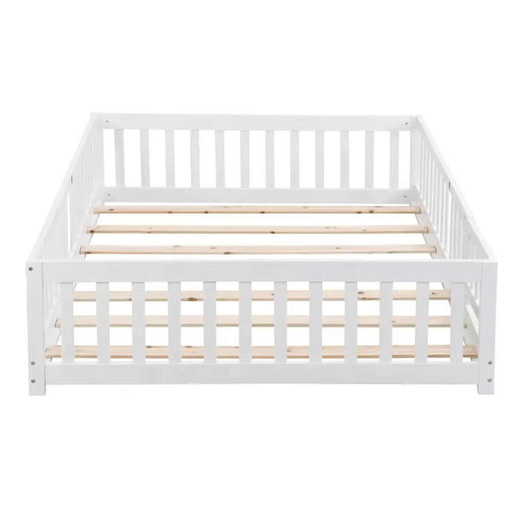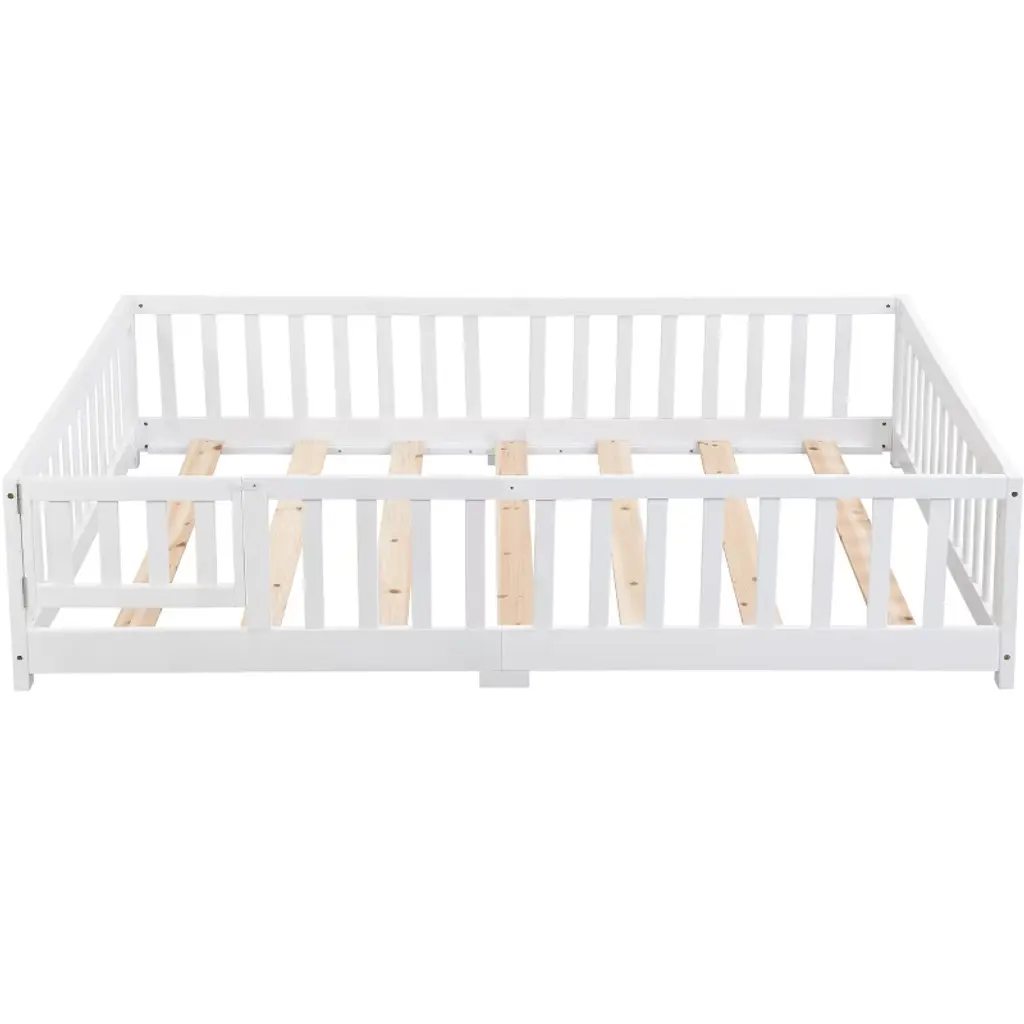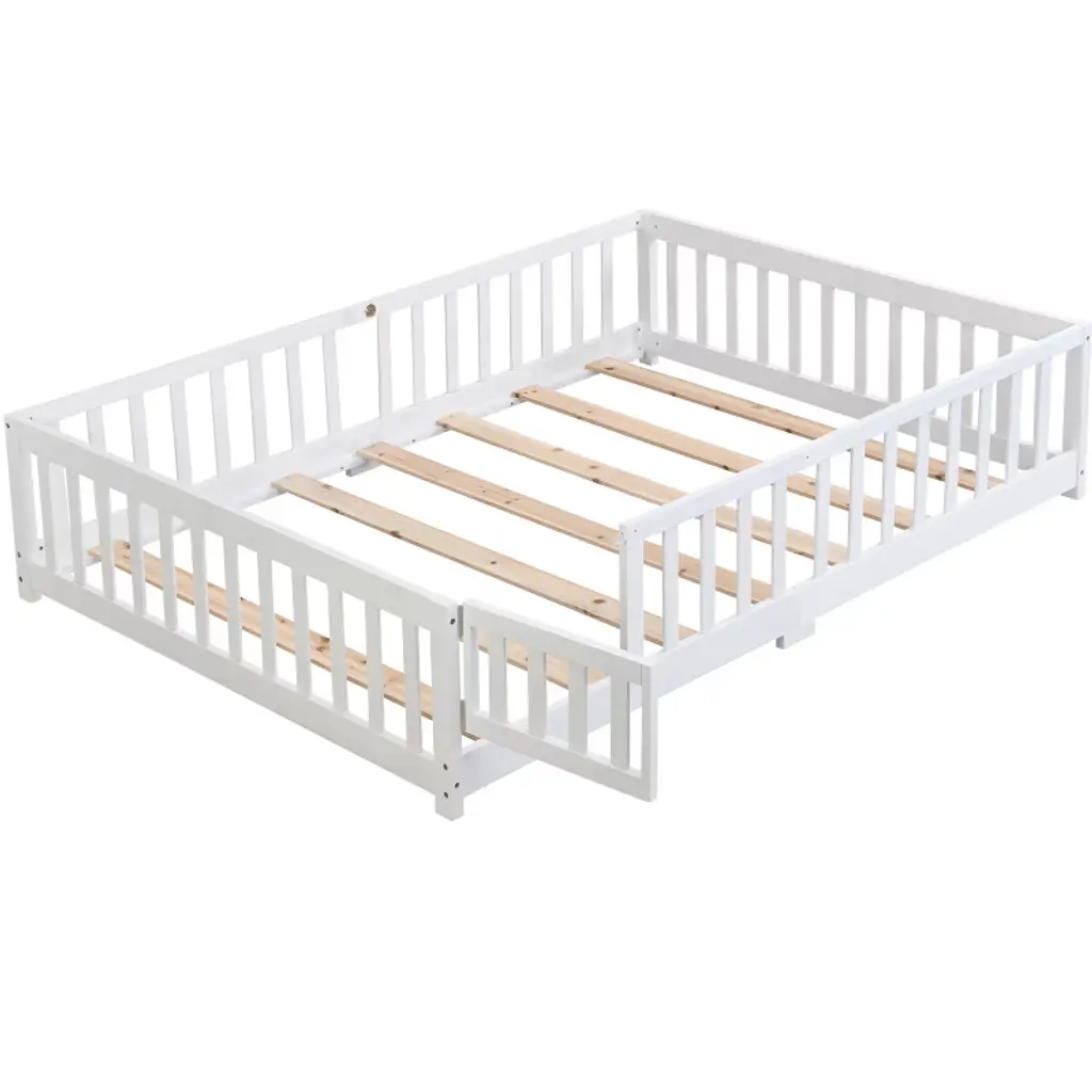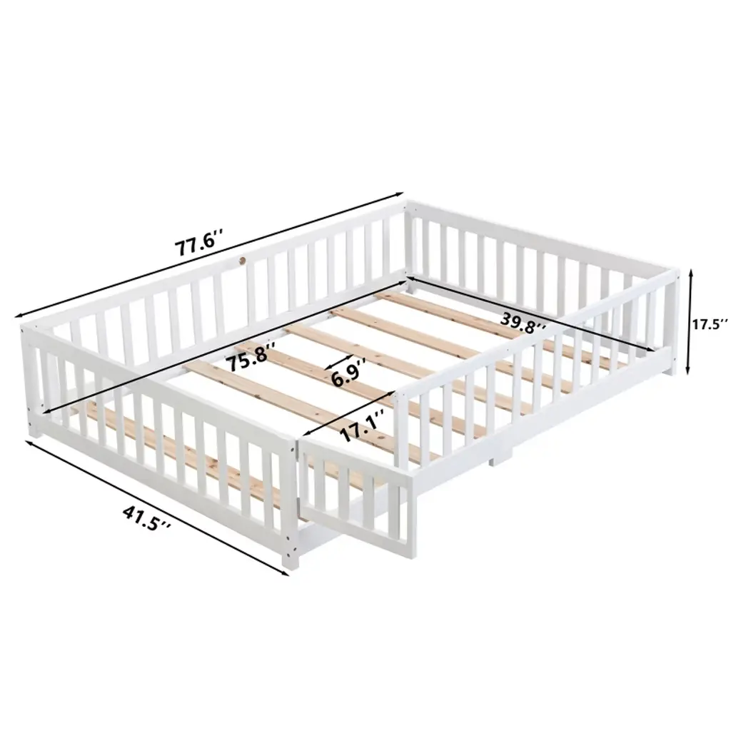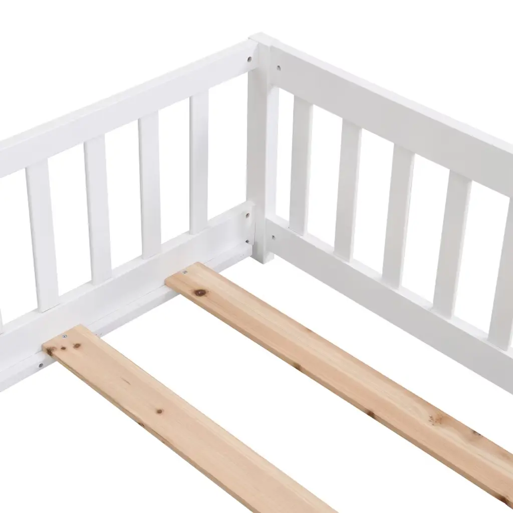 Gulches Twin Kids Floor Bed: White solid wood frame with safety guardrails and a switchable door for enhanced safety. Low-profile design lets kids enter/exit independently; remove slats to double as a play space. Crafted from premium pine and high-quality engineered wood, it sturdy and durable¡ªperfect for sleep and play.