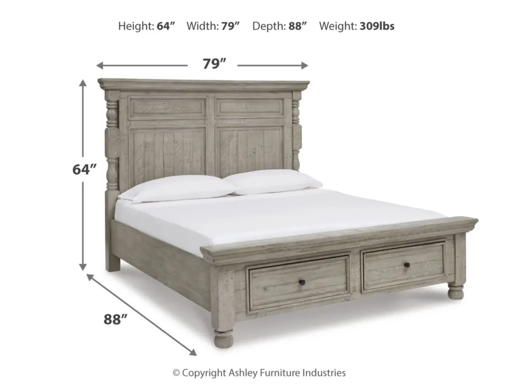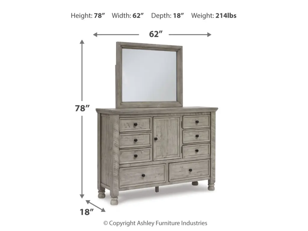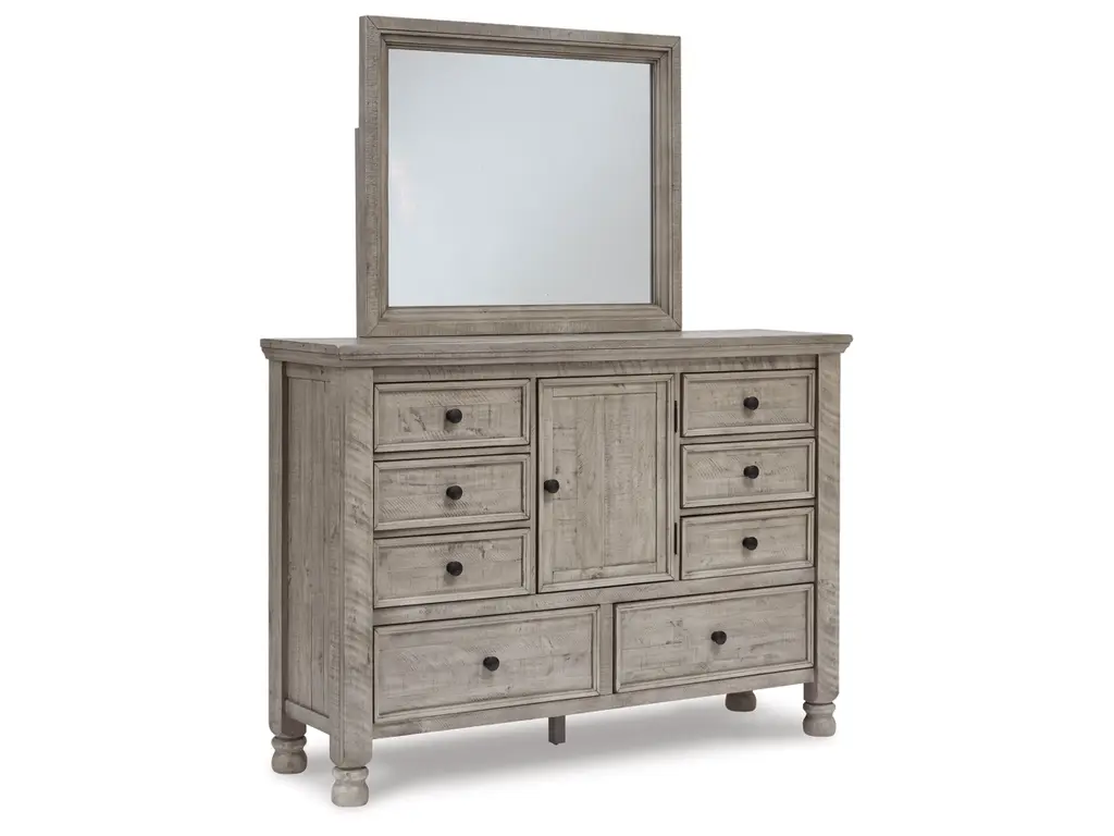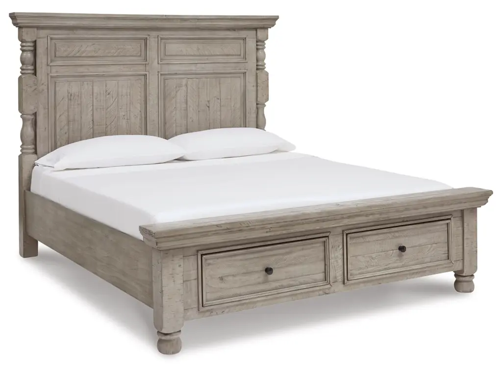 Embrace the feel of a mansion in the countryside when you revel in the romance of the Harrastone bedroom package. With its substantial presence and thick mouldings, it has a sense of timeless beauty. This picturesque set is polished off with a weathered light gray finish that’s delightfully paired with aged iron-tone knobs for a lovingly worn look.
