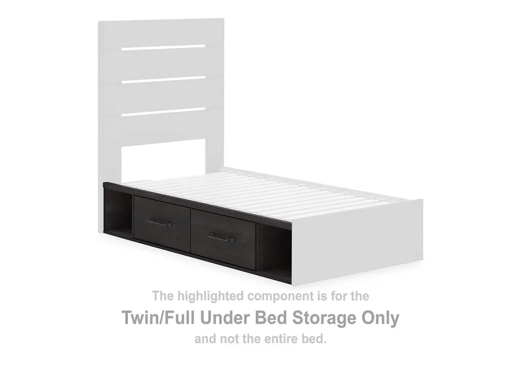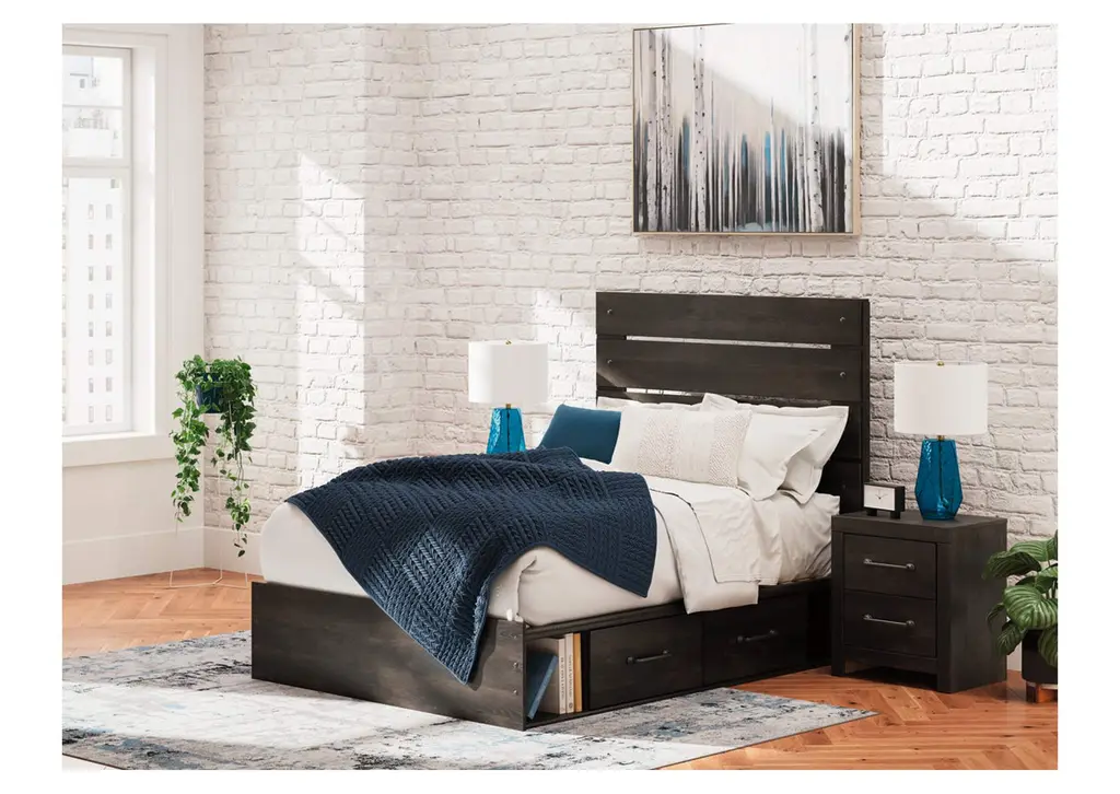 This full panel bed with storage puts a casually chic twist on everyday function. Its rustic charcoal finish pairs well with other neutrals and pops of color alike, giving you the flexibility to change up your aesthetic as you please. Smooth-gliding drawers discreetly tuck away clutter without taking up extra floor space. Weight 284.000 lbs. (127.8kgs.)