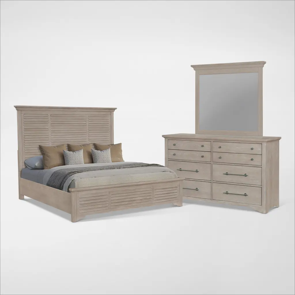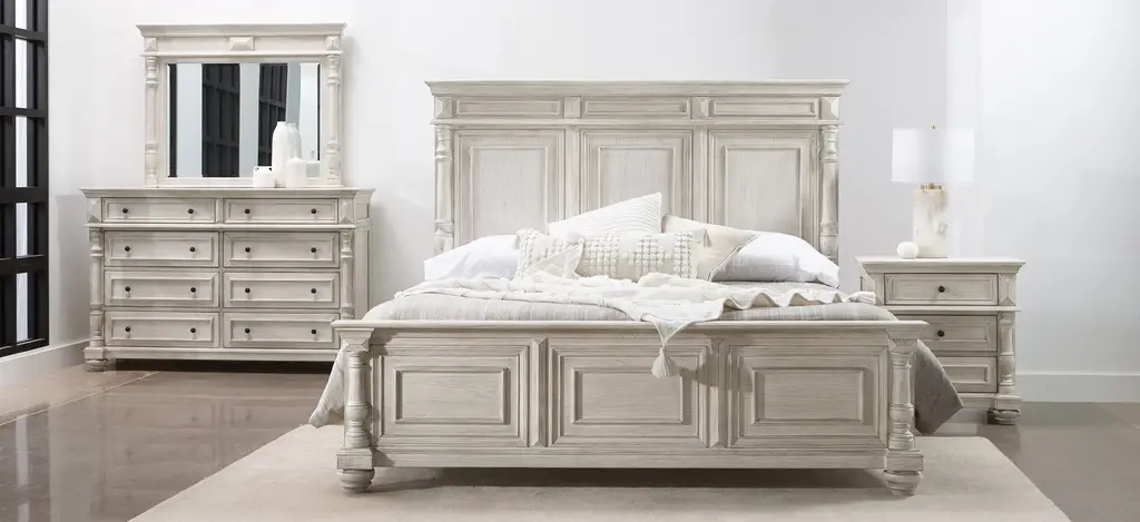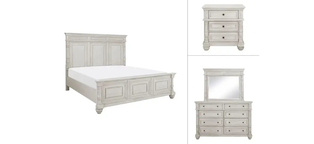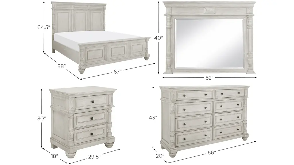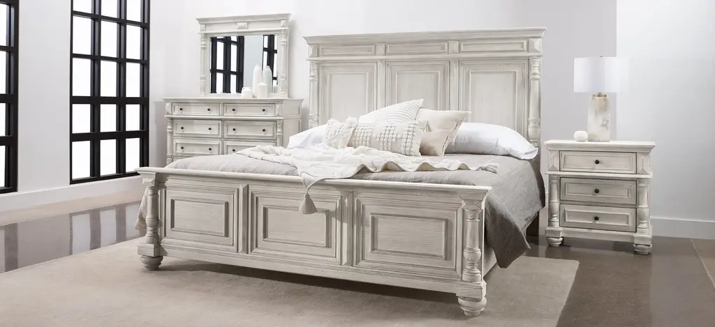 Choose the Ilaria 4-pc. queen platform bedroom set for uncompromised classic style, durability, and good looks. It includes the Ilaria queen platform bed, durable dresser with distressed finish, nightstand with 2 USB ports and bedroom dresser mirror. This is ideal for those seeking a traditional style bedroom set.