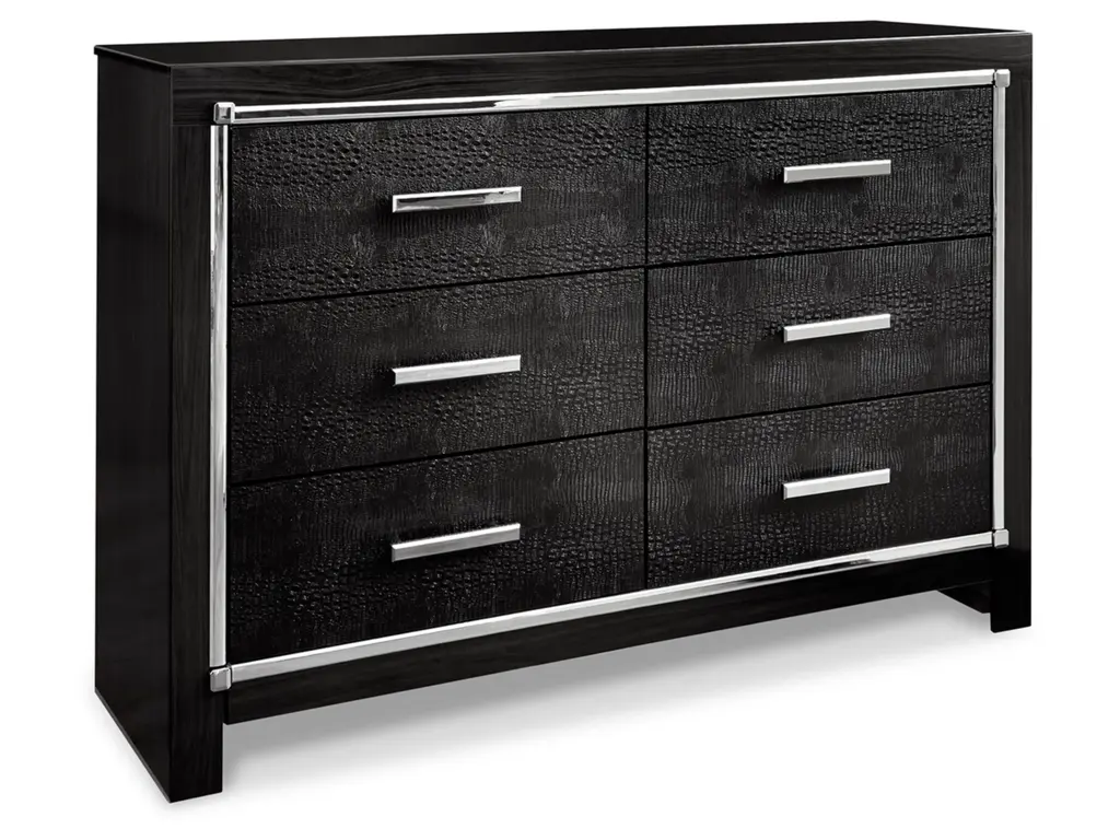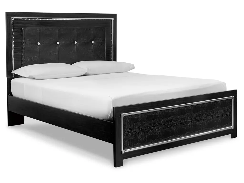 Rest easy. The luxurious look you’ve been dreaming of is yours for the ta—at a price sure to put you at ease. The Kaydell bedroom set brings a sense of old Hollywood with a contemporary flair. A deep, dark finish, faceted chrome-tone accents and LED lighting exude Hollywood-chic style to the max. Padded windowpane-stitching and faux alligator panels infuse a sumptuous look that’s upscale and indulgent, and utterly on trend. Sure to entice those with refined tastes, this set is a contemporary masterpiece.