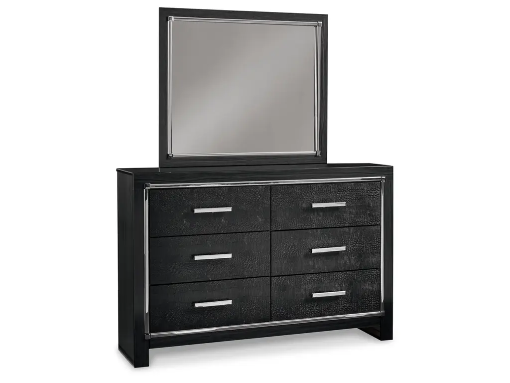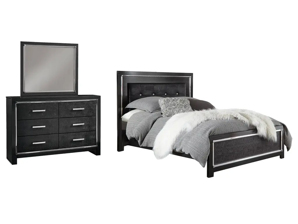 Rest easy. The luxurious look you’ve been dreaming of is yours for the ta—at a price sure to put you at ease. The Kaydell bedroom set brings a sense of old Hollywood with a contemporary flair. A deep, dark finish, faceted chrome-tone accents and LED lighting exude Hollywood-chic style to the max. Padded windowpane-stitching and faux alligator panels infuse a sumptuous look that’s upscale and indulgent, and utterly on trend. Sure to entice those with refined tastes, this set is a contemporary masterpiece.