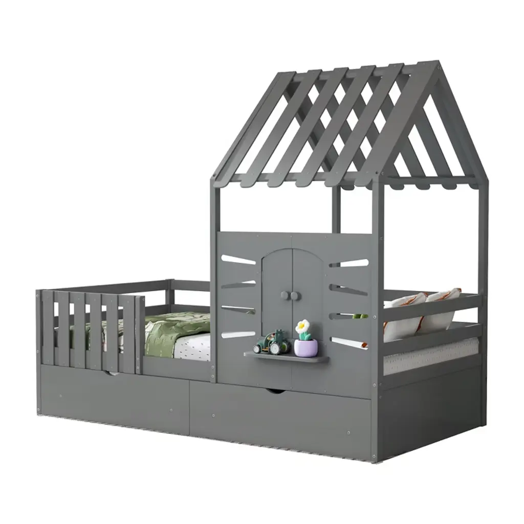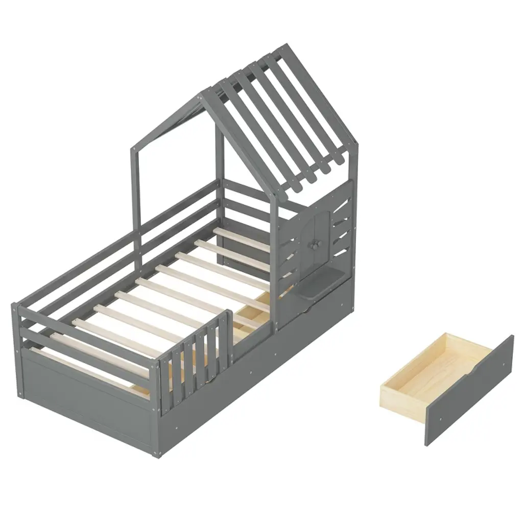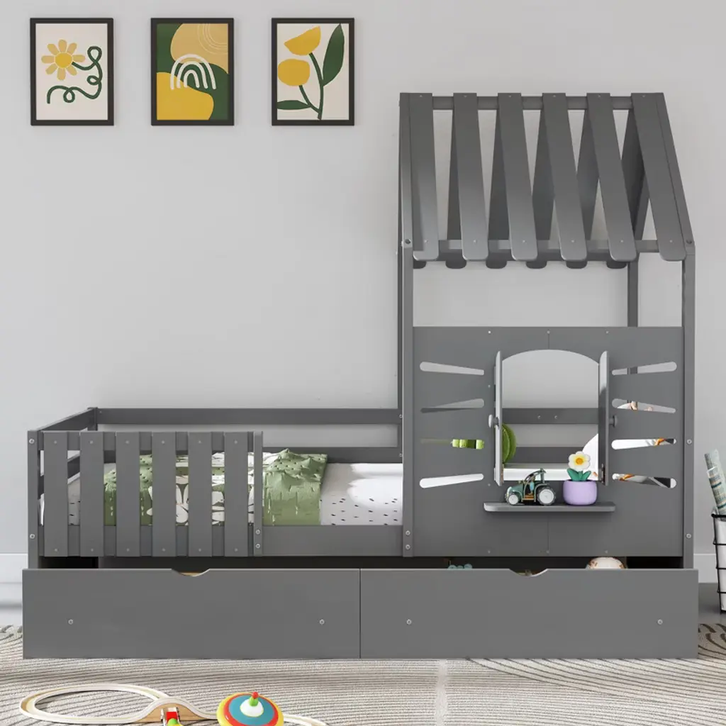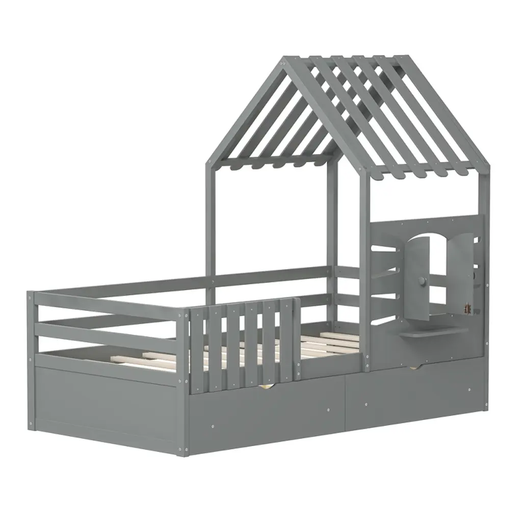 This twin-size house bed features a charming playhouse design with a pitched roof and a built-in window, creating a fun and cozy space for kids. Made from high-quality wood with sturdy guardrails, it ensures safety and durability. A small shelf below the window offers a spot for decorations, books, or toys, adding both function and charm. Two spacious pull-out drawers provide extra storage for clothes and bedding, keeping the room tidy. With a sturdy wooden slat system, it offers excellent mattress support without needing a box spring, making it a stylish and practical choice for any child¡¯s bedroom.