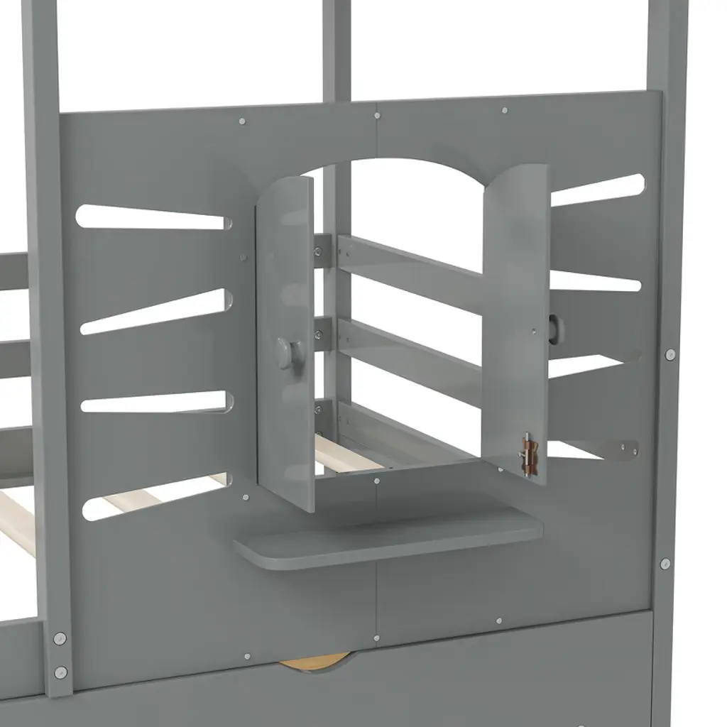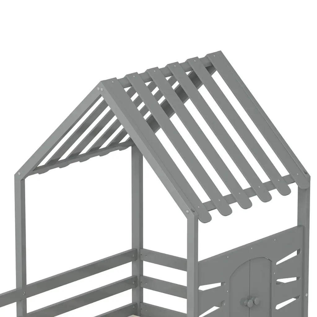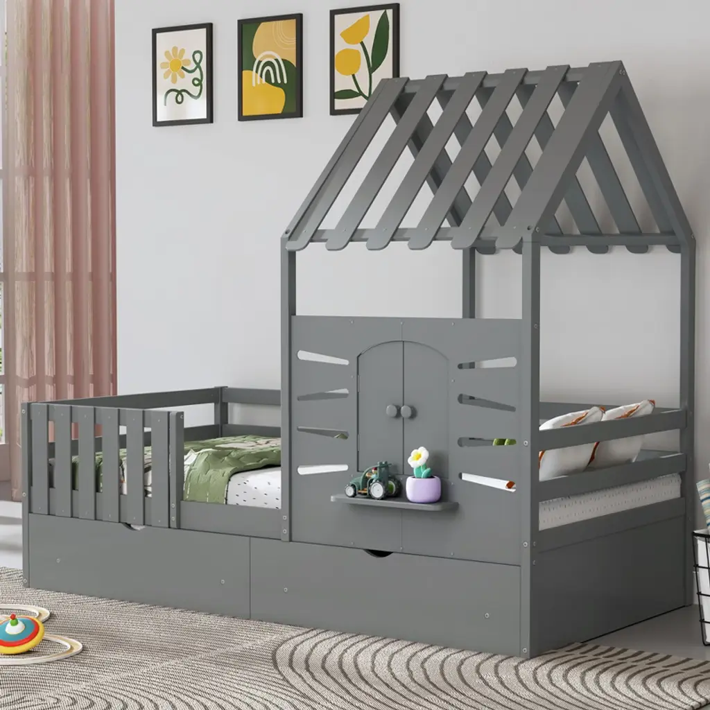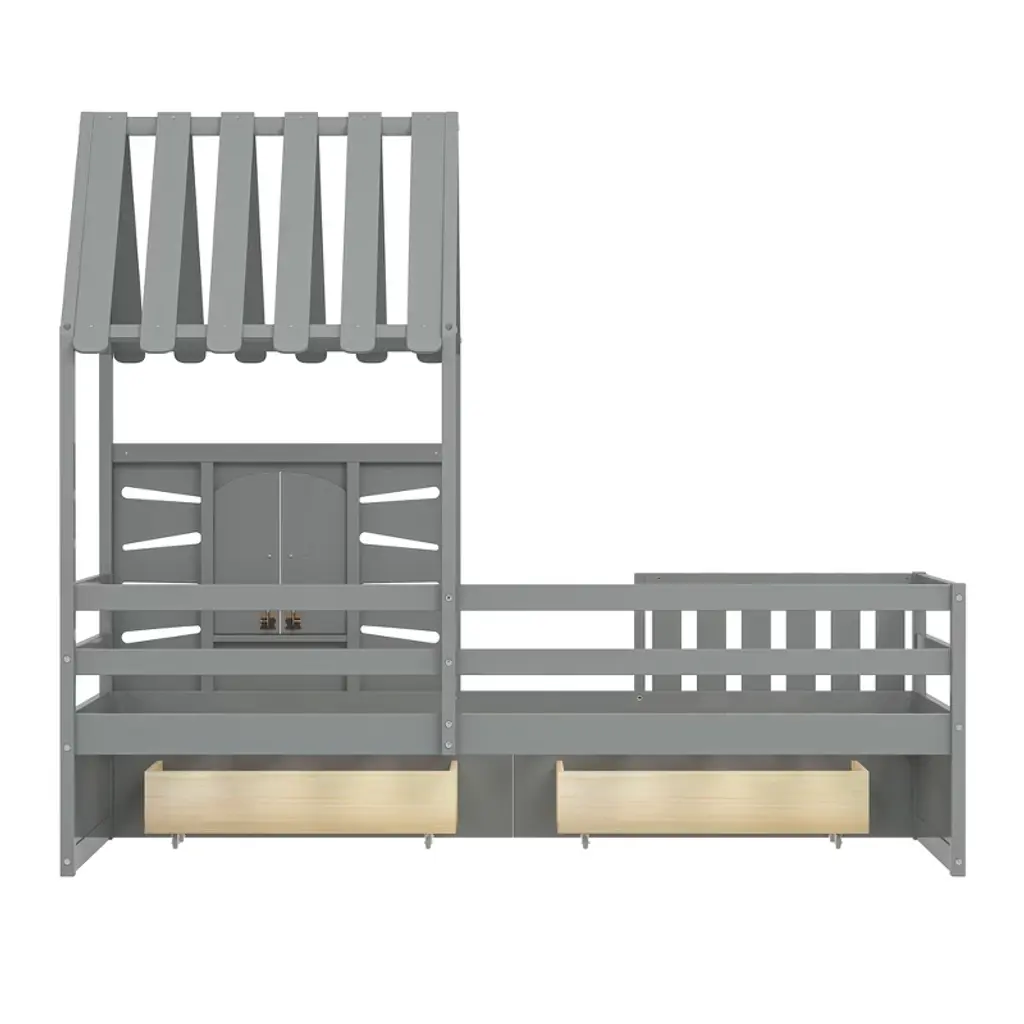 This twin-size house bed features a charming playhouse design with a pitched roof and a built-in window, creating a fun and cozy space for kids. Made from high-quality wood with sturdy guardrails, it ensures safety and durability. A small shelf below the window offers a spot for decorations, books, or toys, adding both function and charm. Two spacious pull-out drawers provide extra storage for clothes and bedding, keeping the room tidy. With a sturdy wooden slat system, it offers excellent mattress support without needing a box spring, making it a stylish and practical choice for any child¡¯s bedroom.
