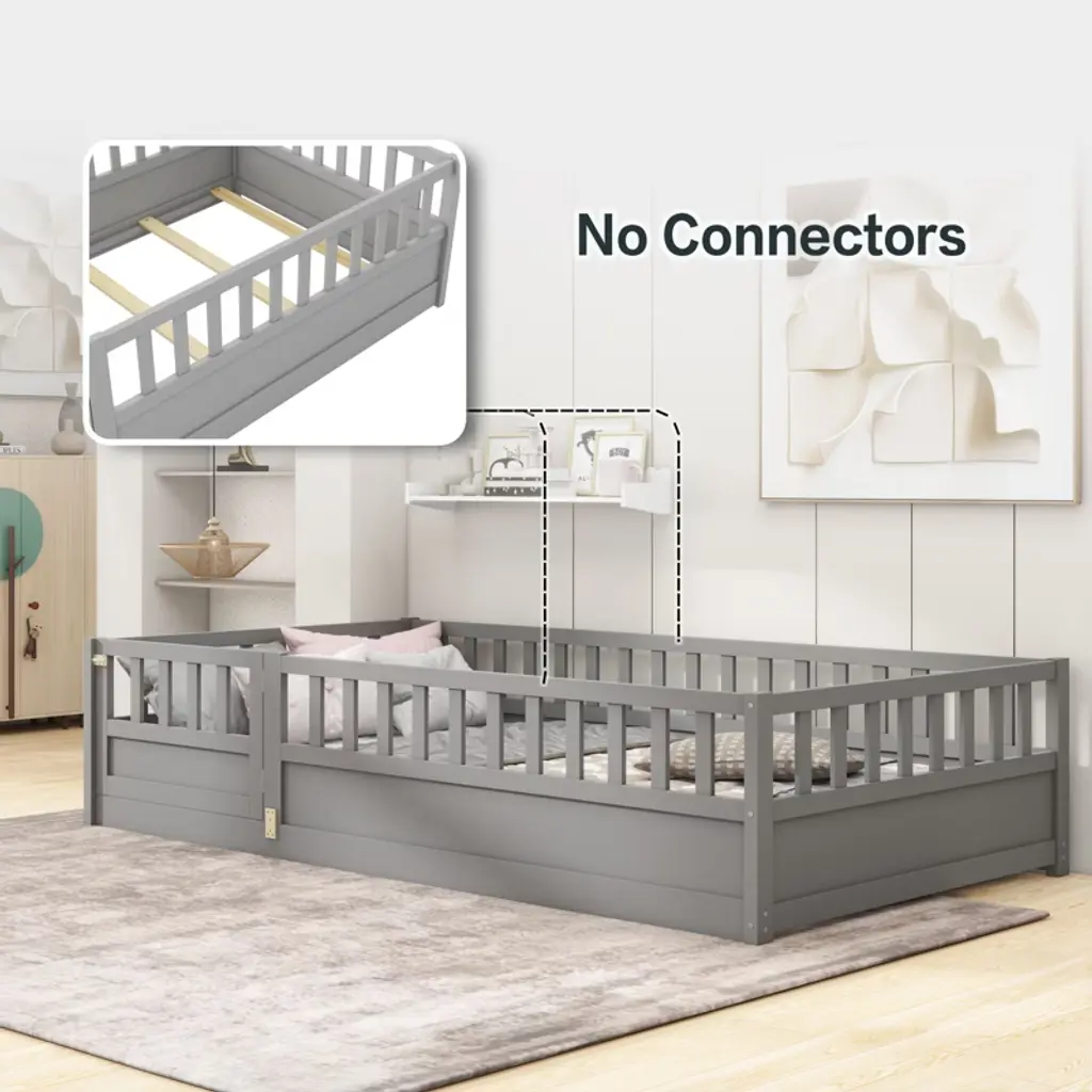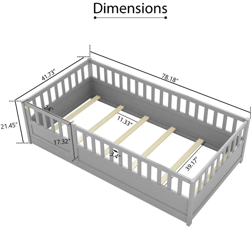 Kumasinova Twin Size Floor Bed With High Security Barrier,montessori Twin Bed Frames With Safety Rails,wood Twin Bed Frame For Kids,grey