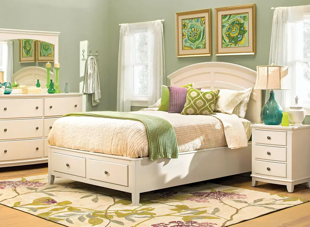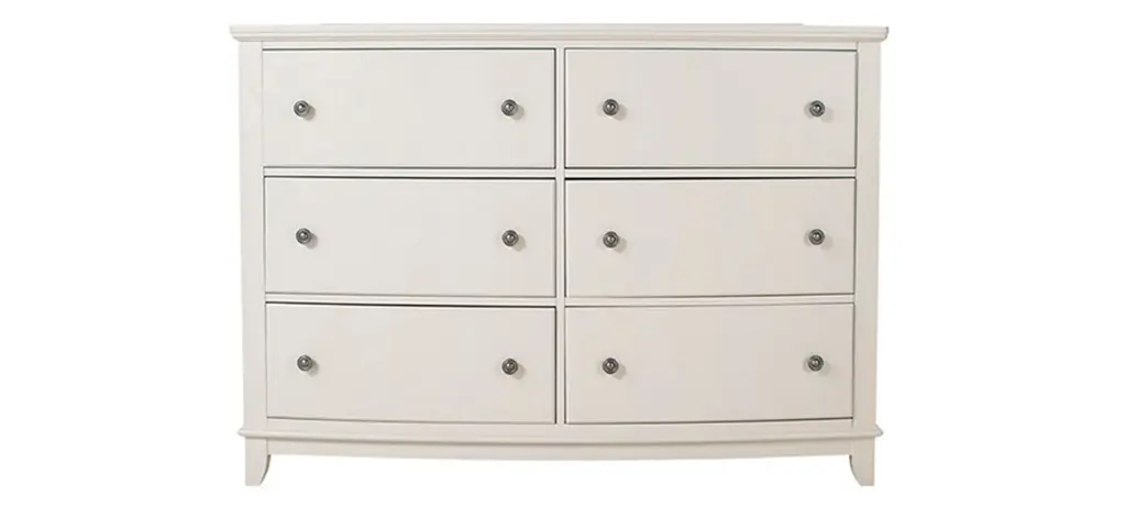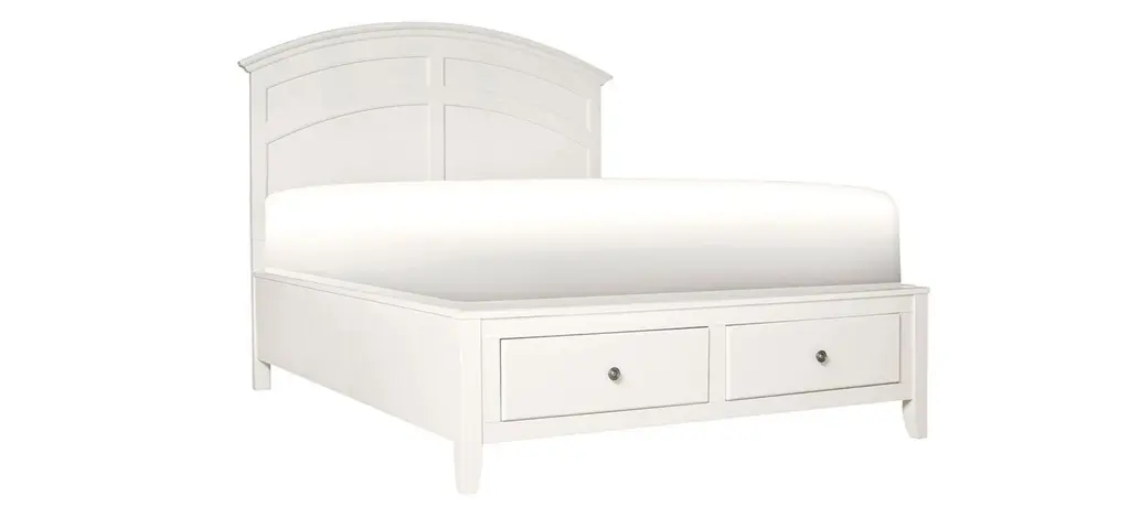 The gentle curves of the Kylie 4-piece queen platform storage bedroom set are what set it apart. From the arched silhouette of the headboard and the dresser mirror to the bowed drawer fronts and boot heel feet, each shapely detail is a graceful accent. The smooth cream finish and round black nickel-finished drawer knobs enhance the simple clean lines of this appealing set.