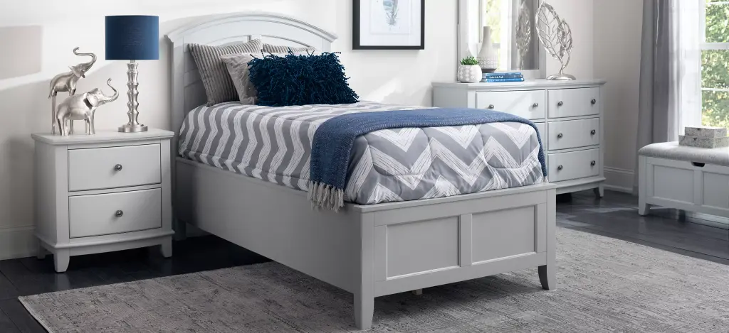 This Kylie 4-piece twin platform bedroom set is the kind of cool and classy furniture your child will love for years! Besides being sleek and chic with a soft cream finish, it provides plenty of space for clothes. Plus, the dresser and nightstand feature felt-lined top drawers that are perfect for storing jewelry, collectables or other special items.