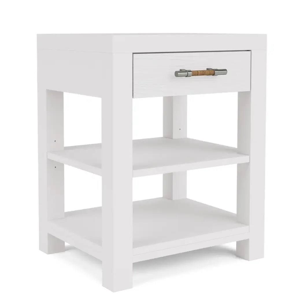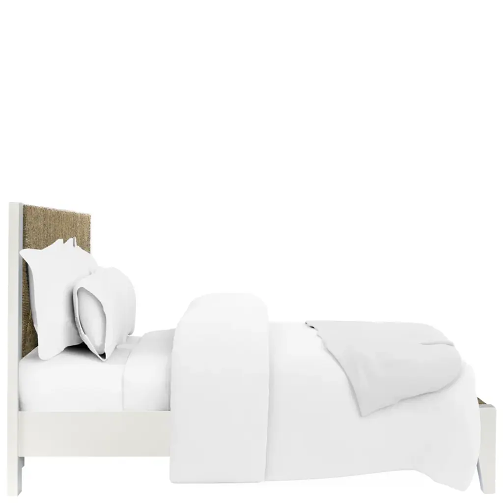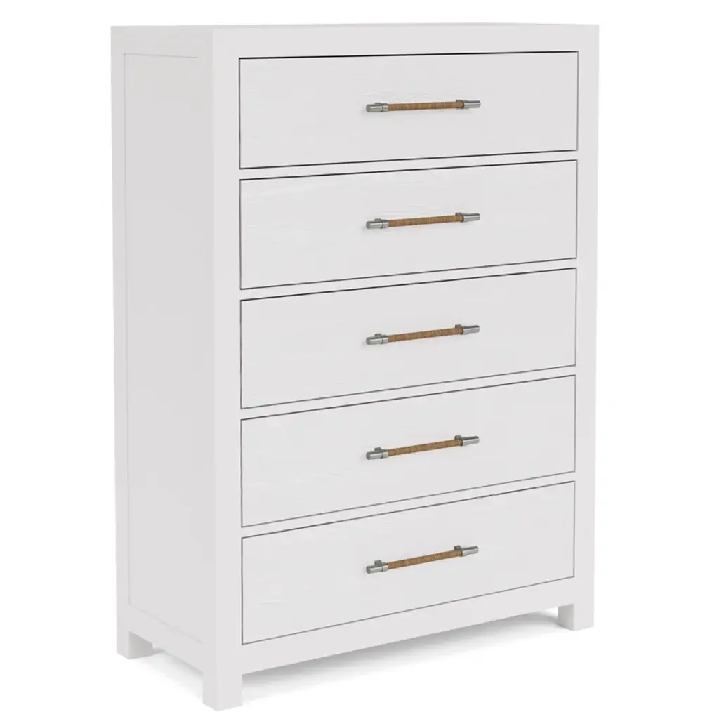 Bring a natural touch to your space with this stunning Bedroom Set! The bed frame, crafted from woven hyacinth and solid wood, adds texture and warmth to your room with its earthy charm. The five-drawer chest, in a crisp white finish, features custom hardware that elevates its sleek design. The one-drawer nightstand with two open shelves is both practical and stylish, complete with a USB charging dock for your convenience. A perfect blend of functionality and cozy elegance!