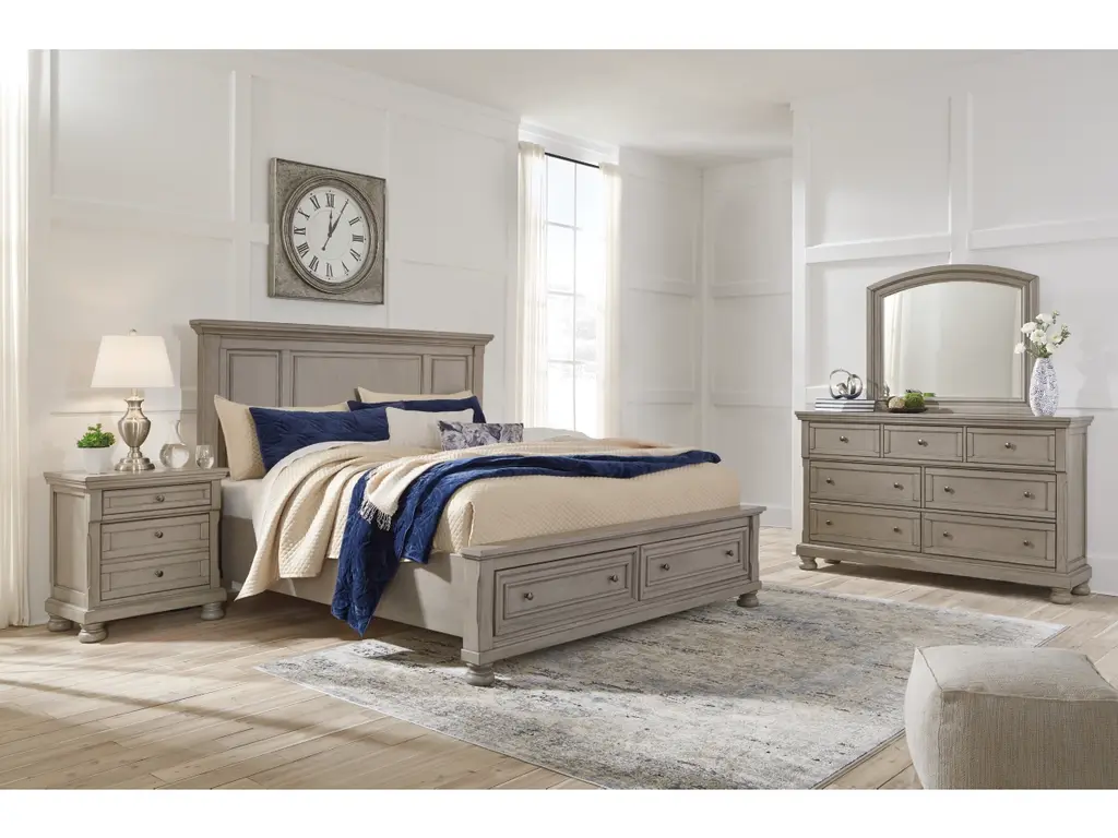 Satisfying your taste for tradition, the Lettner king panel storage bed sports serene sophistication. Forever classic design details like inset panels, silvertone patina hardware and bun feet are so easy to love. A burnished light gray finish elevates the look with modern sensibility. Two roomy drawers keep your essentials organized in style.