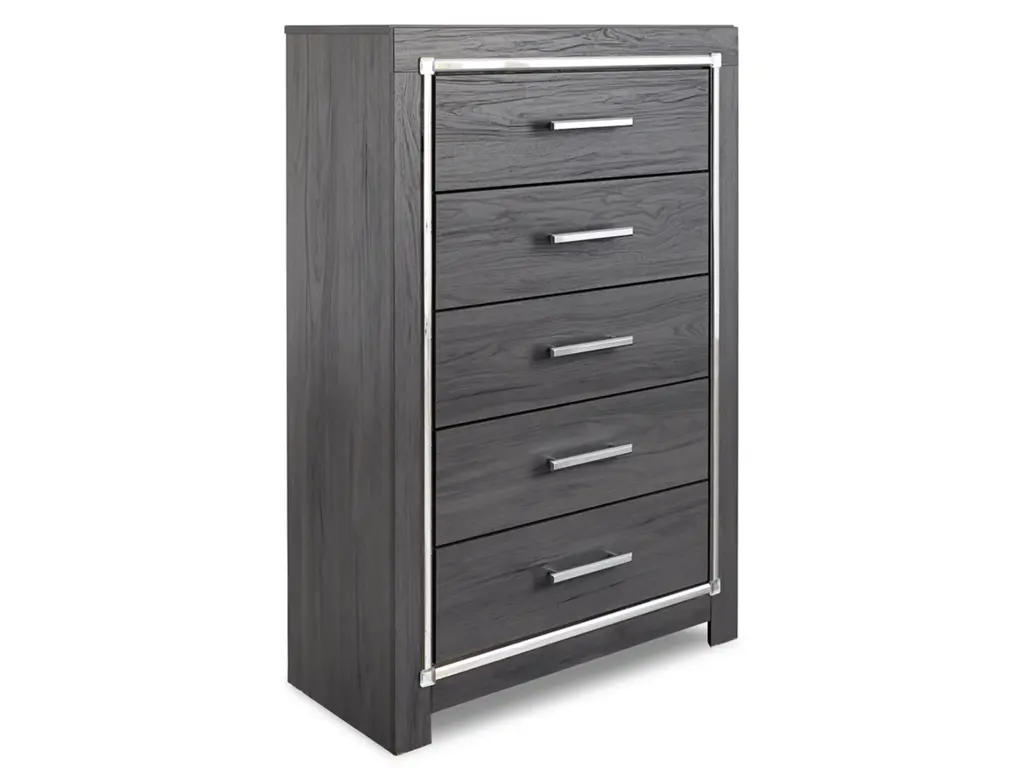 Reminiscent of Hollywood glamour of yesteryear, the Lodanna bedroom set with queen bed with storage, dresser/mirror and chest interprets luxury in a decidedly modern way. Headboard details include button-tufted upholstery, faceted faux crystals and LED lights enhanced with remote-controlled settings for color and brightness. Chrome-tone drawer pulls and accents are a chic complement to the dazzling gray finish.