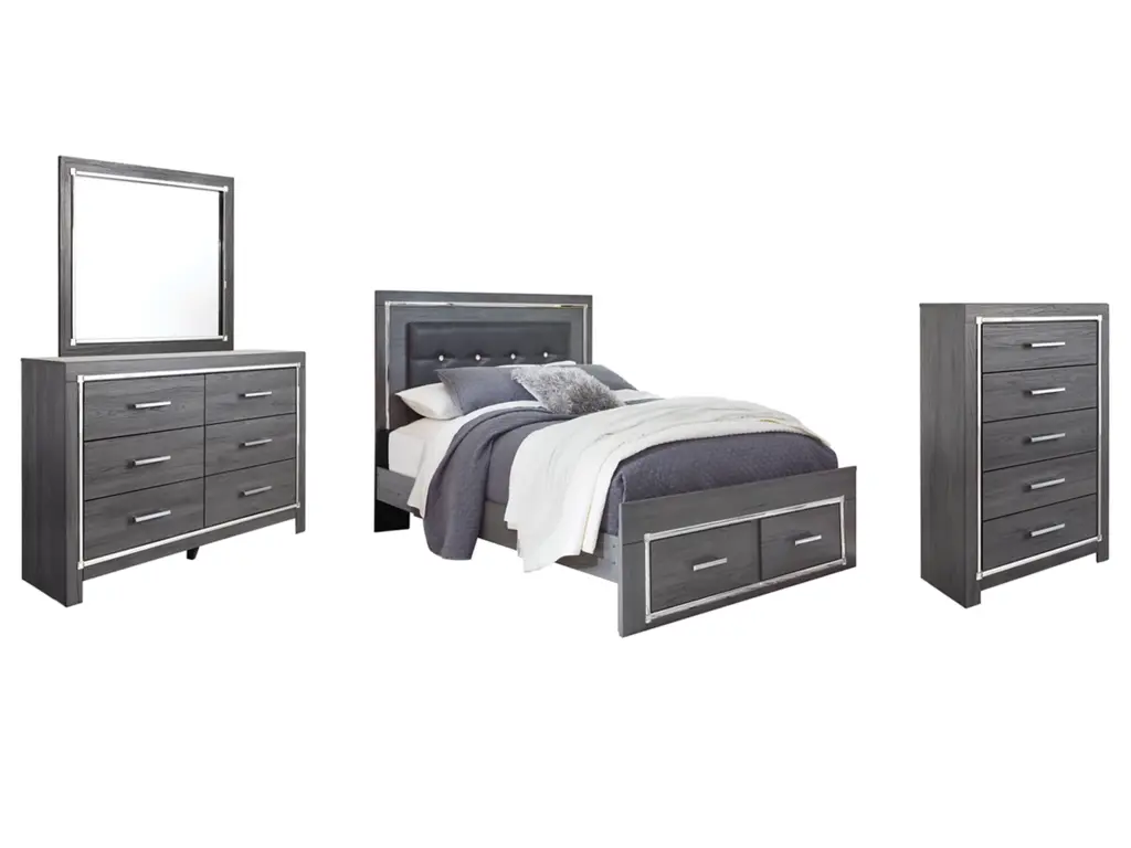 Lodanna Queen Panel Bed With 2 Storage Drawers With Mirrored Dresser And Chest