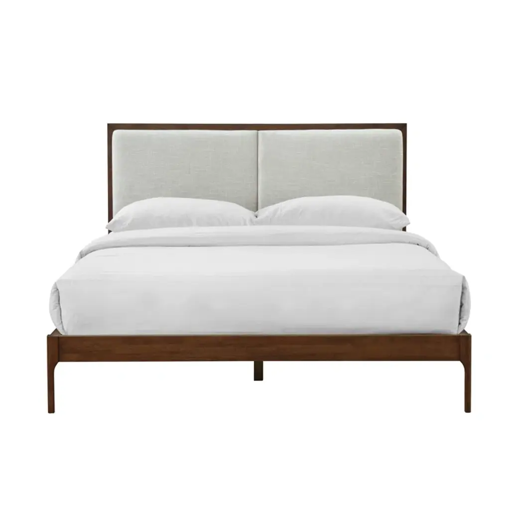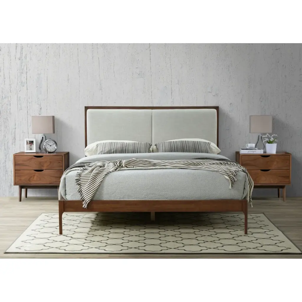 This 3-piece bedroom set pairs streamlined silhouettes with wood grain finishes, making it a one-stop-shop for upgrading your bedroom with a retro-meets-minimalist look. It includes a bed and two nightstands, all made with solid wood. The bed has a clean-lined design with an upholstered headboard and tapered dowel legs, giving it that mid-century-inspired look. The nightstands have a matching look, and include two drawers so that you can easily stash your before-bed essentials. Plus, the bed frame has an included slat kit, so you don't need to add a box spring.