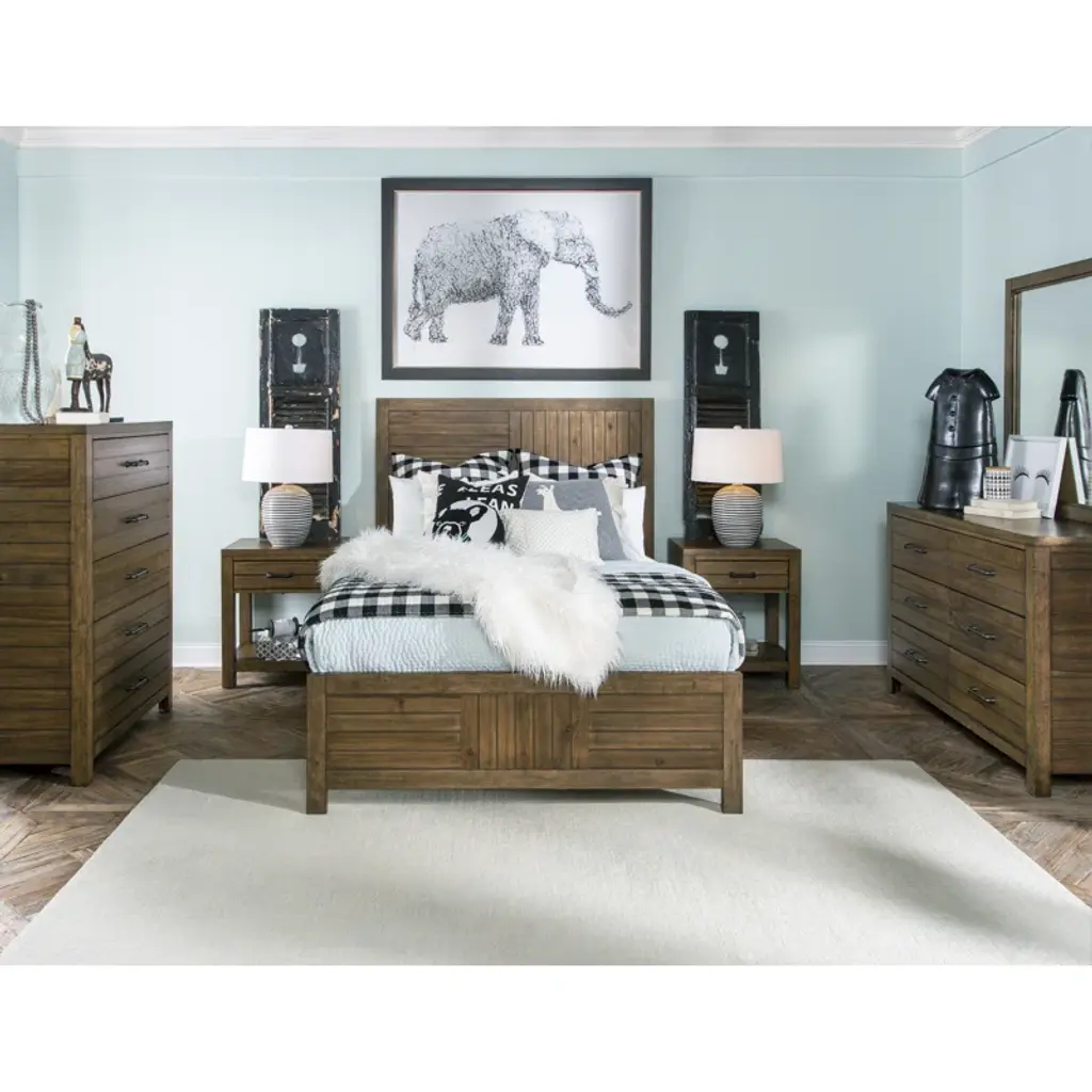 The set captures the look and feel of being away at camp. Straight lines and plank details add a modern rustic appeal to the look of this bed. The complete bed comes with the headboard, footboard, rails, and a twin slat roll, so there is no need for a box spring. Crafted of select hardwood solids in a lightly distressed, treehouse brown finish.