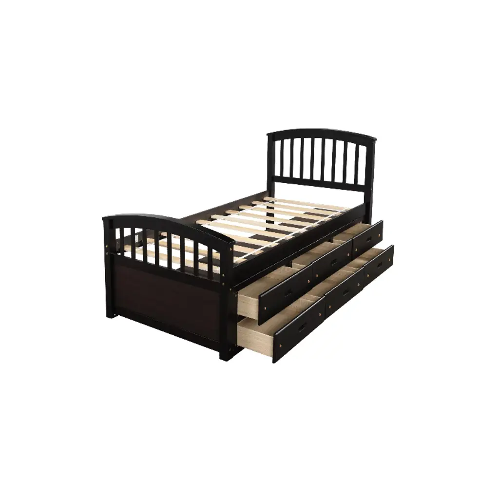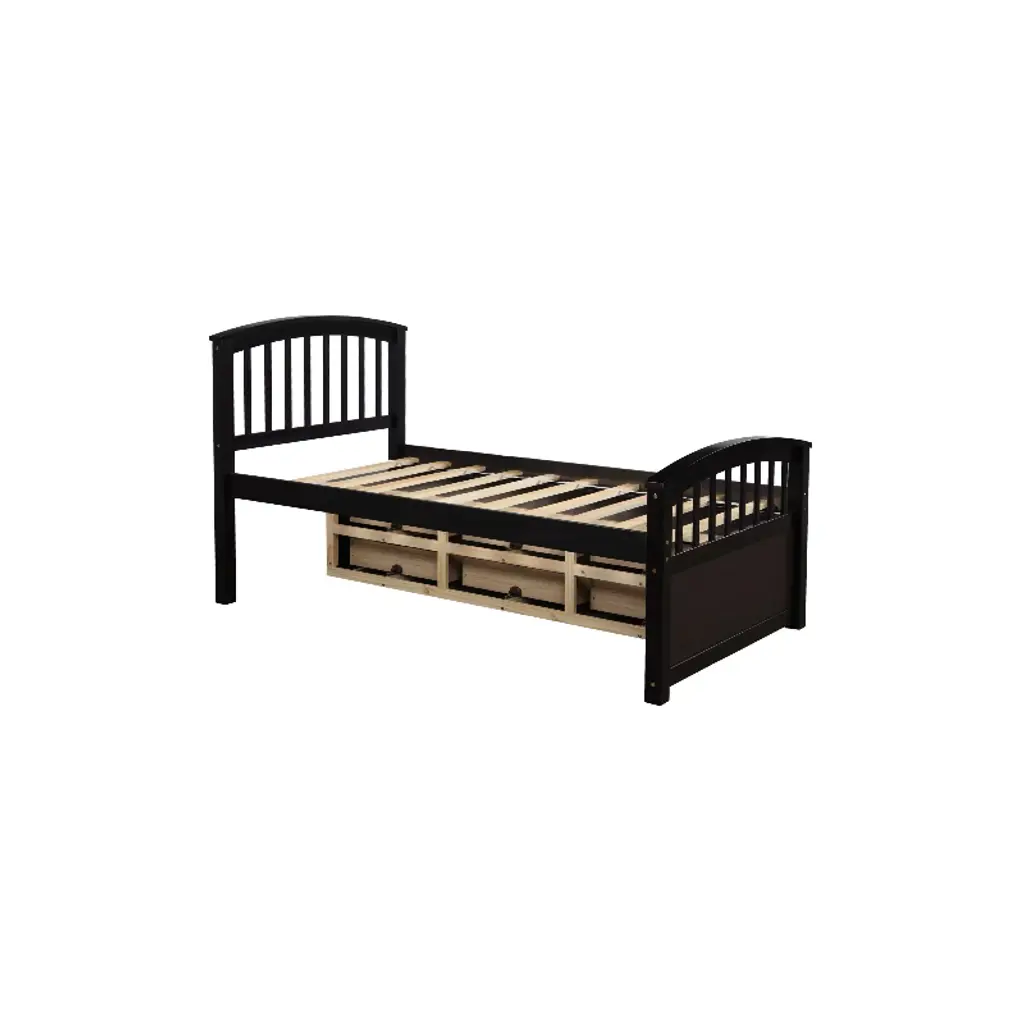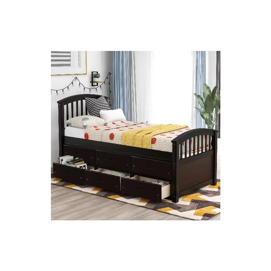 Maximize space and style with this twin storage bed frame, crafted from high-quality solid pinewood for durability and safety—ideal for kids’ rooms. Featuring built-in drawers for extra storage (keeping bedrooms tidy), it fits a standard twin mattress (not included) and includes 10 sturdy slats to support up to 200 lbs (no box spring needed). The rich espresso finish complements both modern and vintage decor, making it a versatile choice for girls’ and boys’ rooms. With environmentally friendly materials and a non-toxic green paint surface, it prioritizes your child’s health. As one of the practical beds with headboards, this storage bed blends functionality and charm, perfect for growing families.