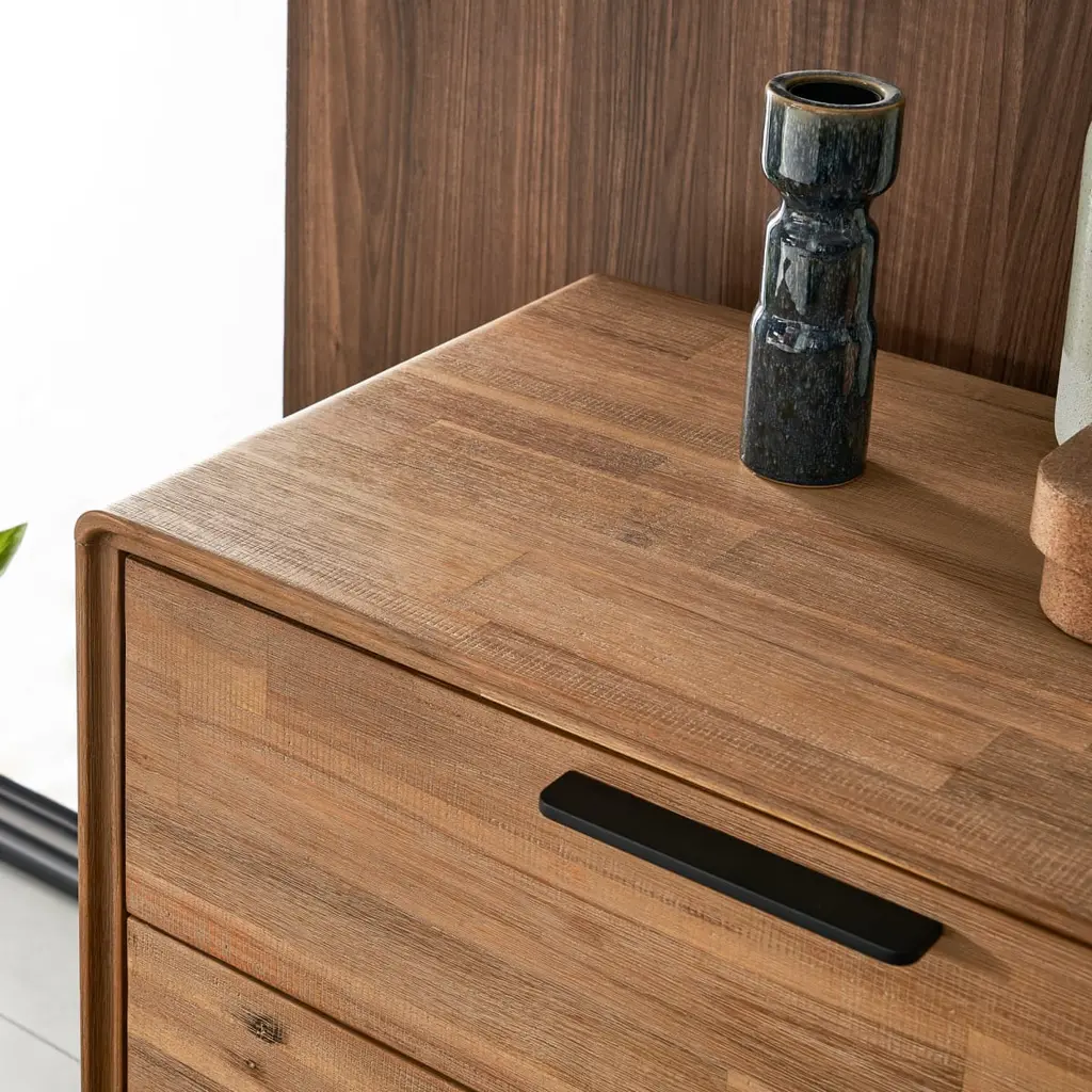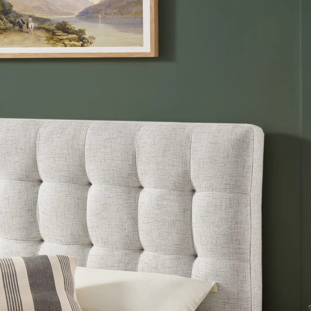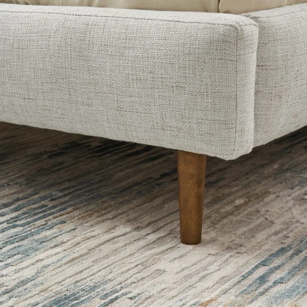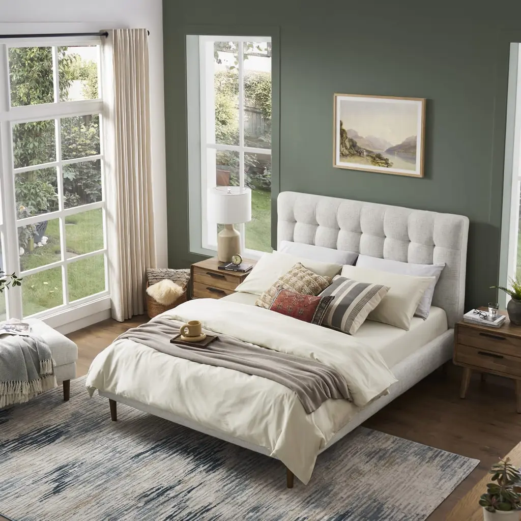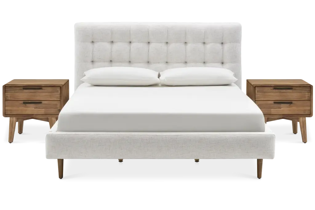 Bring a cozy mid-century modern appeal to your bedroom with Madison's biscuit tufted headboard and Seb's rustic wood finish.