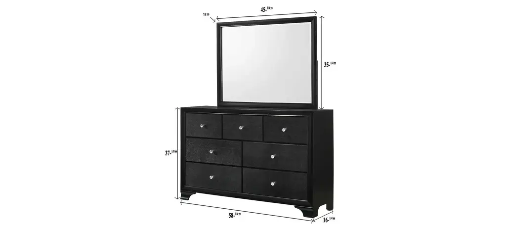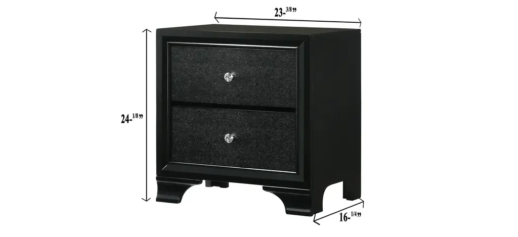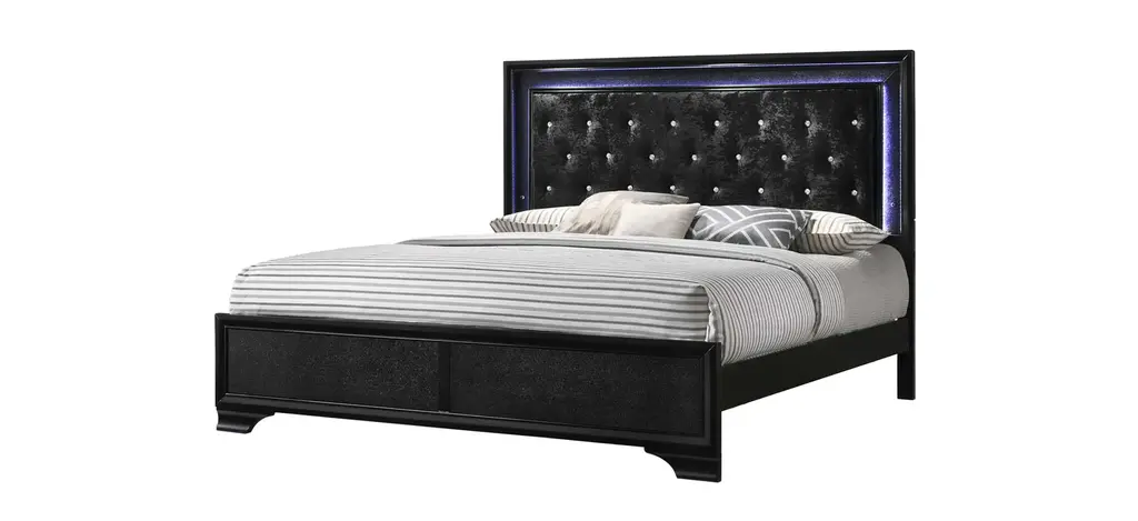 Be on the cutting edge of trends with the Micah 4-pc. King Bedroom Set. It's perfect to show off your fun side. You'll love the glamorous design with its sleek black finish. The headboard has 3 way LED touch lighting framed around the button tufted crushed black velvet headboard. The modern 7-drawer dresser with matching beveled mirror and two-drawer nightstand have crocodile embossing and beautifully fun faux crystal knobs. Imagine the fun your future holds when you dream in style.