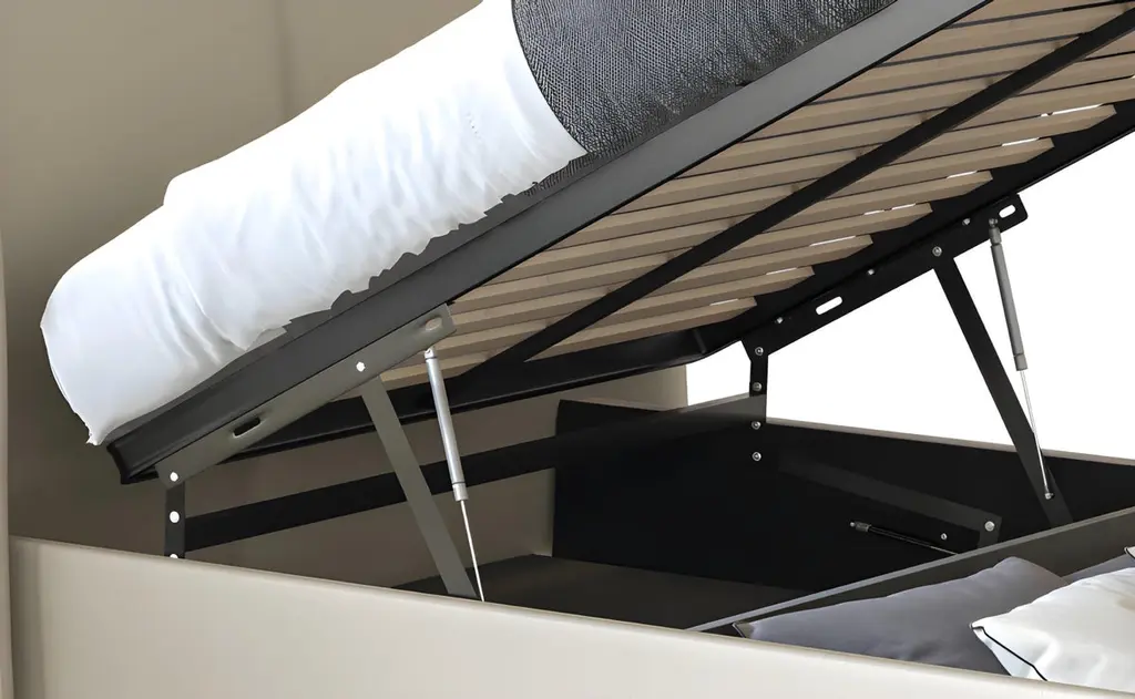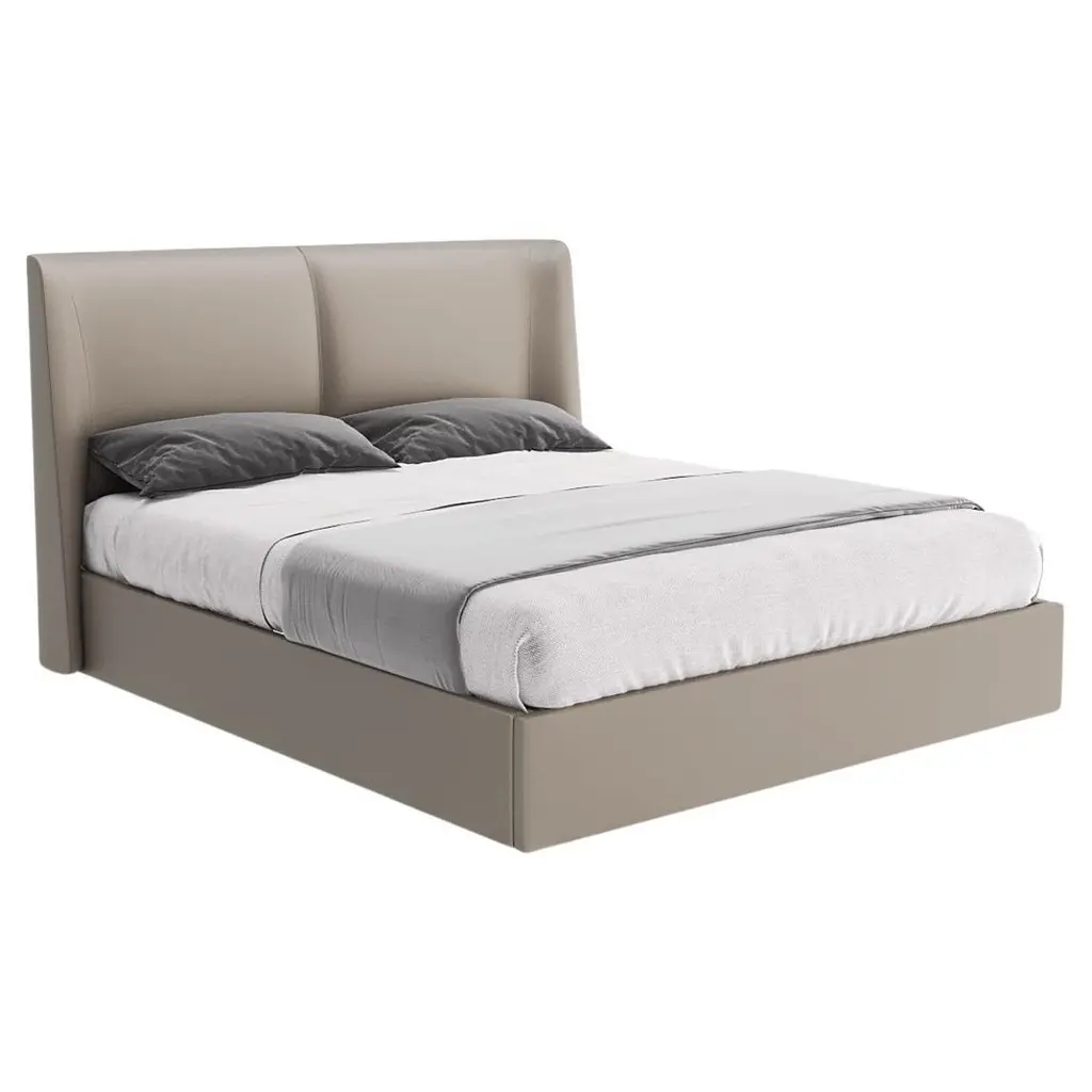 Experience ultimate functionality and elegance with this sophisticated faux leather bed, designed to blend contemporary aesthetics with practical features.The sleek headboard, upholstered in premium faux leather, is accentuated by a single, straight stitch running down its center, adding a touch of understated detail. The headboard gently curves at the edges, creating an inviting and seamless design that enhances the bed's overall soft silhouette.This bed also features an innovative storage mechanism. With a simple lift, the mattress base raises smoothly and efficiently, revealing a spacious storage compartment underneath. The mechanism lifts the mattress up and forward, providing easy access while maintaining structural stability and ease of use. Faux Leather Storage Queen Bed with Curved Headboard and Lift-Up MechanismPerfect for modern bedrooms, this bed offers the ideal combination of style, comfort, and storage—making it a smart choice for those who value both design and functionality.Headboard Dimensions: 48" High x 83" Wide x 6" DeepRail Dimensions: 83"W x 86"L x 15.5"HInside Dimensions: 77"W x 81"LAvailable in queen size and California king.Customer's Own Material (COM) available upon request.