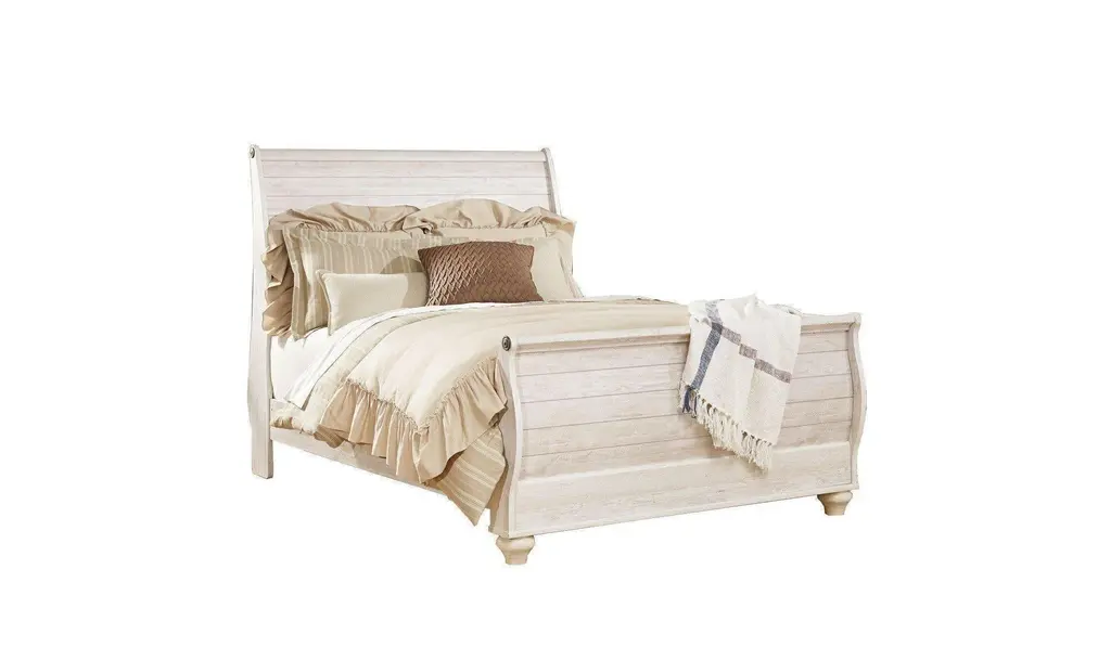 The seaside cottage or shabby chic design of the Willowton Sleigh Bedroom Set adds a rustic appeal to your bedroom. With its two-tone whitewashed finish, the set authentically evokes the impression of worn wood, lending it a classic and laid-back vibe. For added texture and visual appeal, the sleigh bed's headboard, footboard, and rails are all fashioned with a pattern inspired by wood grain blocks. This bedroom set is made to last because it is composed of attractive laminate and sturdy engineered wood. Its faded white finish gives it charm and versatility to fit into many different types of bedrooms. The set needs a foundation or box spring (separately purchased) to finish the appearance. An adjustable base can be used in addition for further comfort. There is also a mattress available for individual purchase. The Willowton Sleigh Bed is ideal for anyone who wants to give their bedroom a dash of rustic character because it is stylish and functional.