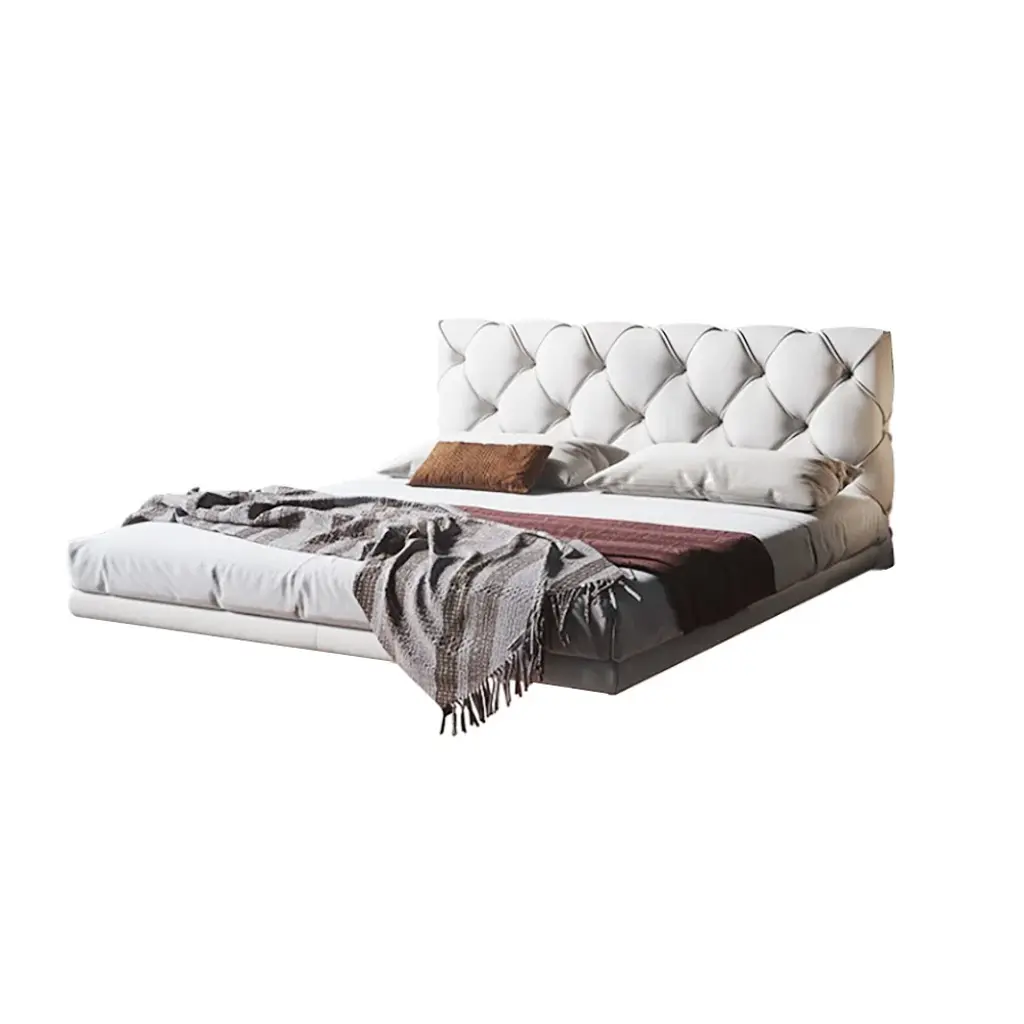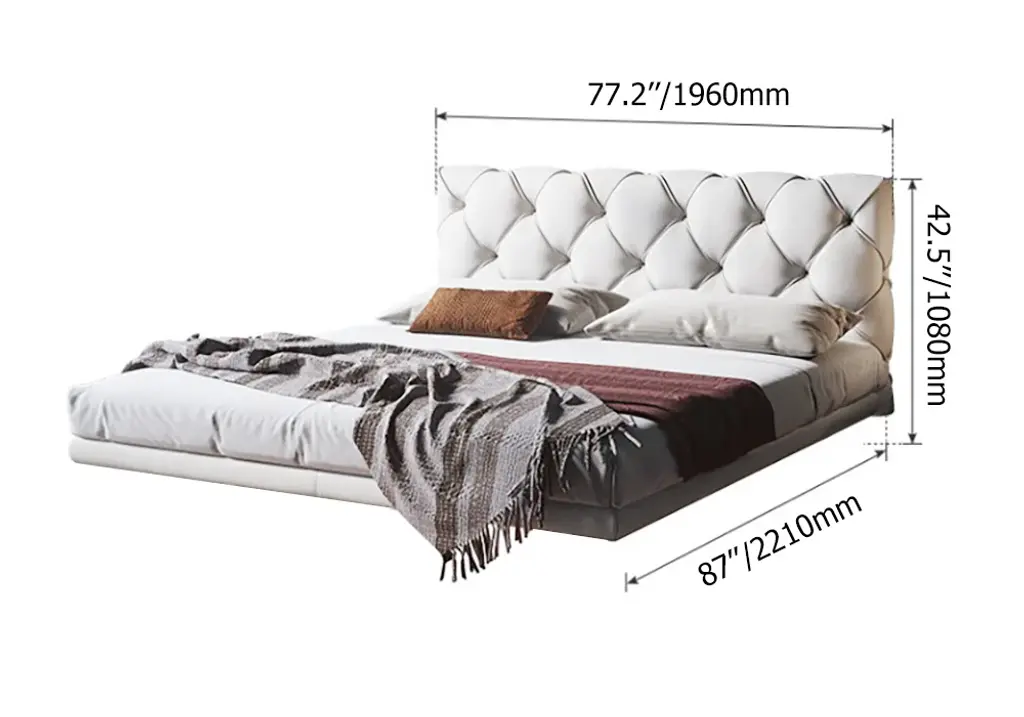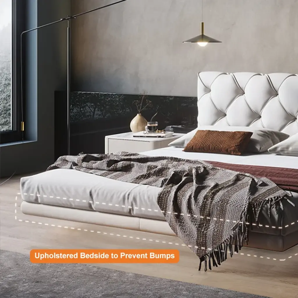 This king-size floating white bed is the ultimate choice that ties your bedroom décor together in style. Framed in sturdy and high-quality pine wood slats with built-in carbon steel frame. Featuring diamond button tufted headboard, which is ergonomically designed to strongly support your head, shoulder, waist and hip to reduce your burden.Not only can you enjoy high-quality comfort and good sleep but also a tidy and clean room.