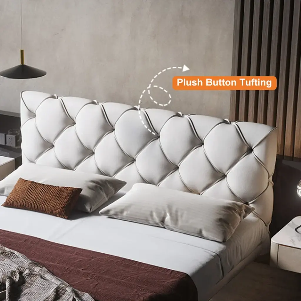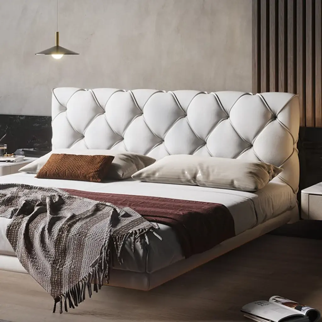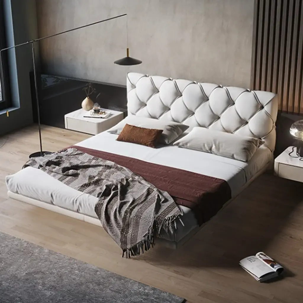Modern King Floating Bed With Microfiber Upholstery Tufted Headboard In White