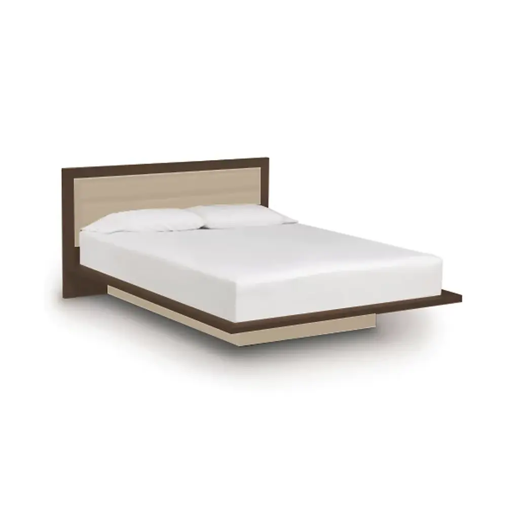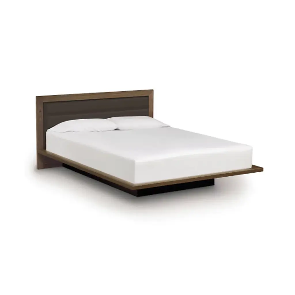 Made in Vermont by Copeland Furniture. The Moduluxe 35-Inch Platform Bed with Microsuede Headboard is a modern platform bed with a softly upholstered inset headboard. The cozy yet crisply styled silhouette features solid maple, cherry or American black walnut hardwood construction with an inset headboard in tufted microsuede, offered in five colors. A deeply set plinth base gives the bed its visually stunning floating motif. The Moduluxe Platform Bed with Microsuede Headboard is designed for use with a mattress only (recommended mattress height - 10”) and is available in Queen, King or Cal King sizes. Select bed size and wood color/finish in one of two satin surface finishes: standard Copeland Lacquer top coat or formaldehyde free Copeland Water Based top coat. Then select Microsuede color. Copeland Furniture's Moduluxe Series offers sectional furniture for the bedroom. This highly configurable bedroom and storage system adapts to most spaces and needs. The Moduluxe Platform Bed with Microsuede Headboard is a stylish standalone piece or may be.
