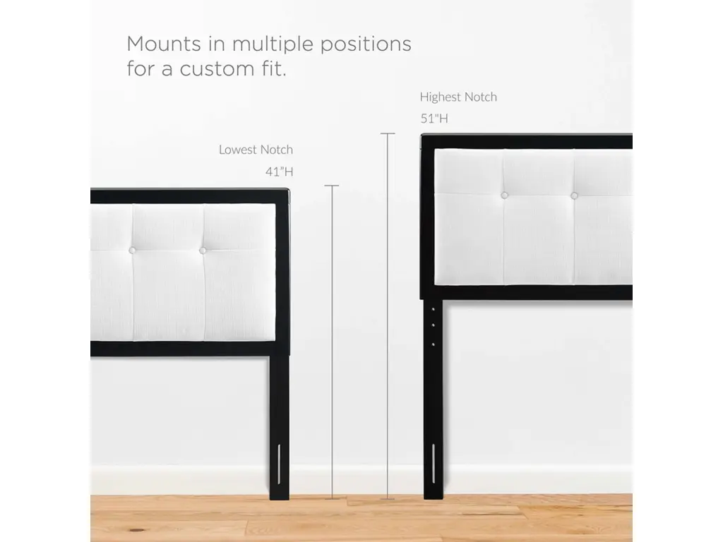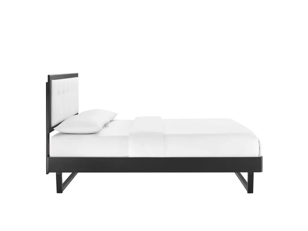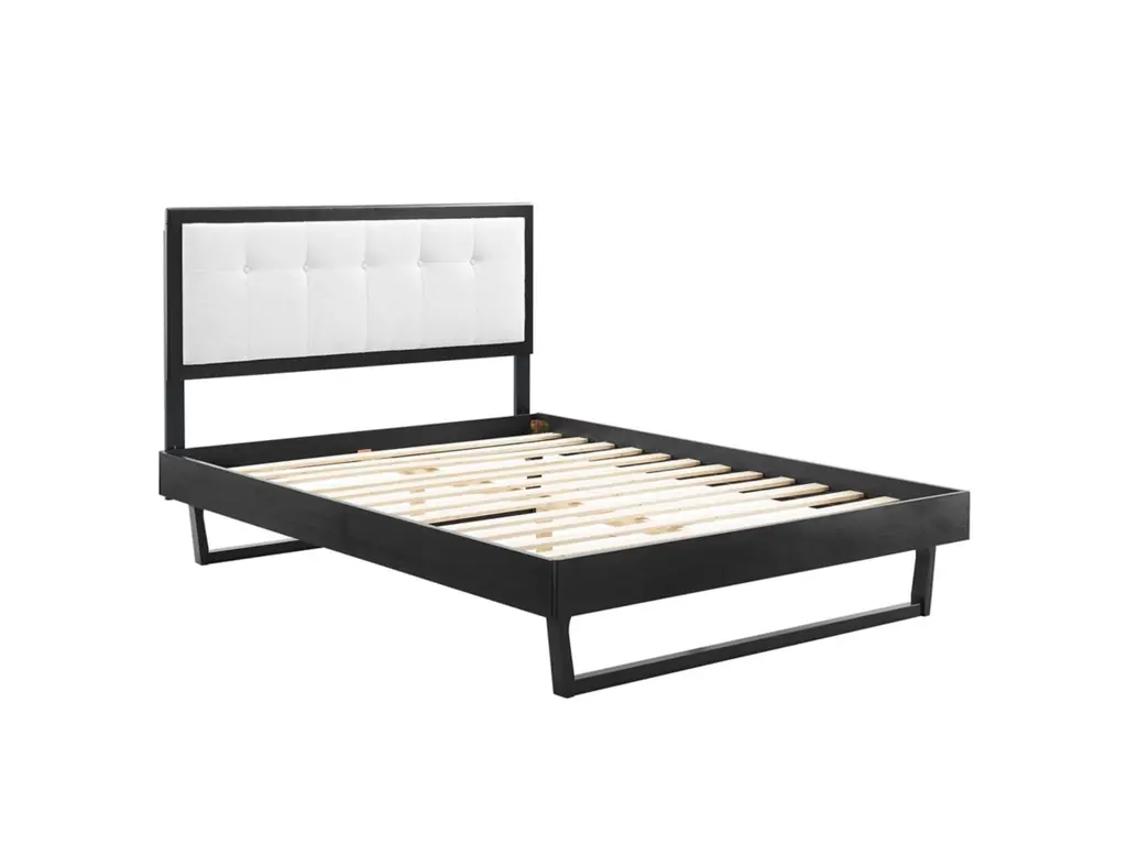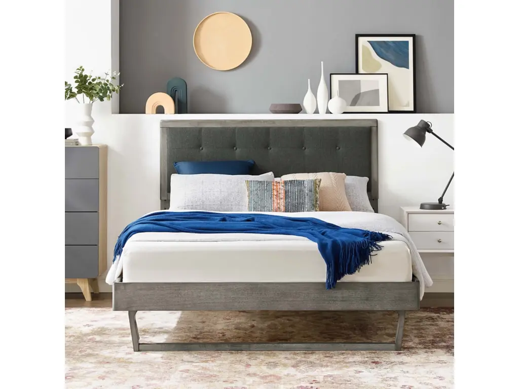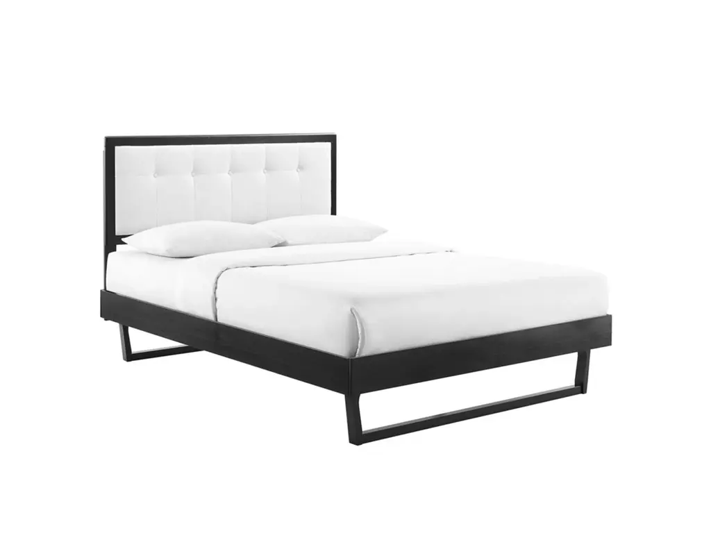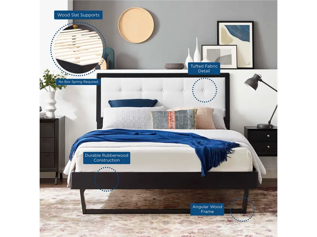 Refresh your master bedroom or guest room with the modern style, retro detail, and organic aesthetics of the Willow Tufted Wood Full Platform Bed. Inspired by mid-century style, the upholstered headboard of this full bed frame features a beautiful wood frame that encases a button tufted design. This platform bed frame is a sturdy addition to the bedroom with a durable wood, MDF, and veneer construction and an angular rubberwood frame. Eliminating the need for a box spring, this full bed is complete with a wood slat support system, reinforced center beam, and supporting legs that make it a lasting mattress foundation for memory foam, latex, innerspring, and hybrid mattresses. Assembly required. Full bed frame weight capacity: 601 lbs.