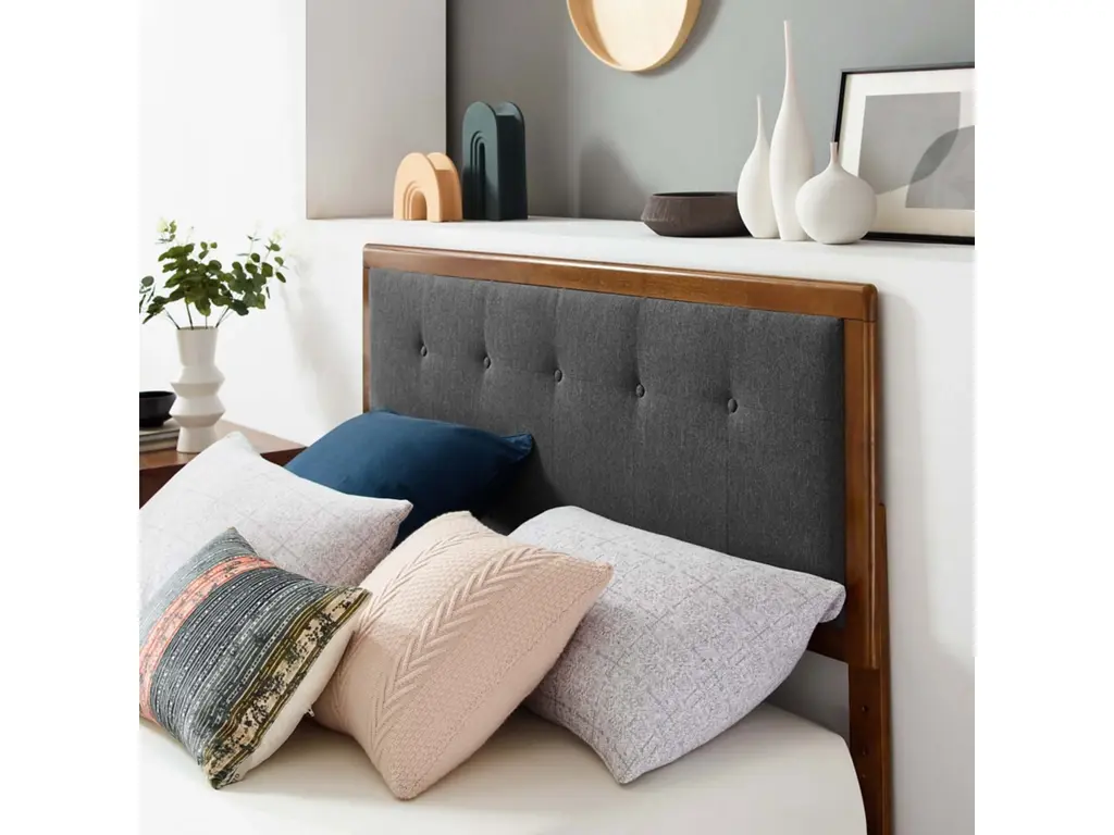 Refresh your master bedroom or guest room with the modern style, retro detail, and organic aesthetics of the Willow Tufted Wood King Platform Bed. Inspired by mid-century style, the upholstered headboard of this king bed frame features a beautiful wood frame that encases a button tufted design. This platform bed frame is a sturdy addition to the bedroom with a durable wood, MDF, and veneer construction and an angular rubberwood frame. Eliminating the need for a box spring, this king bed is complete with a wood slat support system, reinforced center beam, and supporting legs that make it a lasting mattress foundation for memory foam, latex, innerspring, and hybrid mattresses. Assembly required. King bed fame weight capacity: 601 lbs.