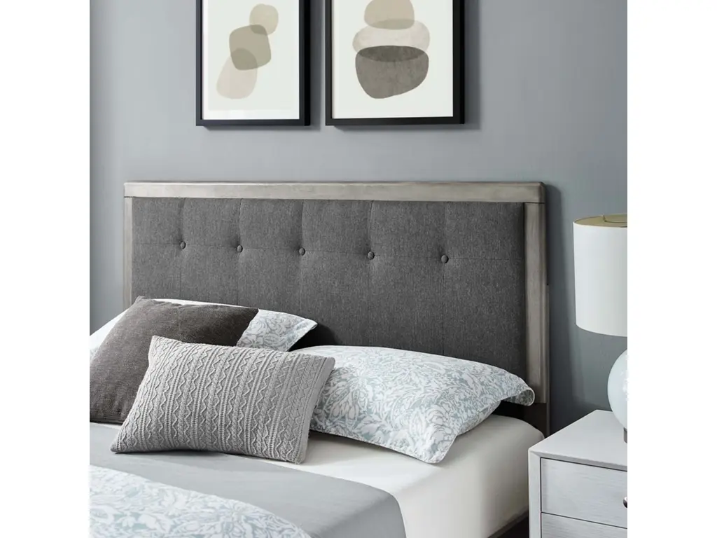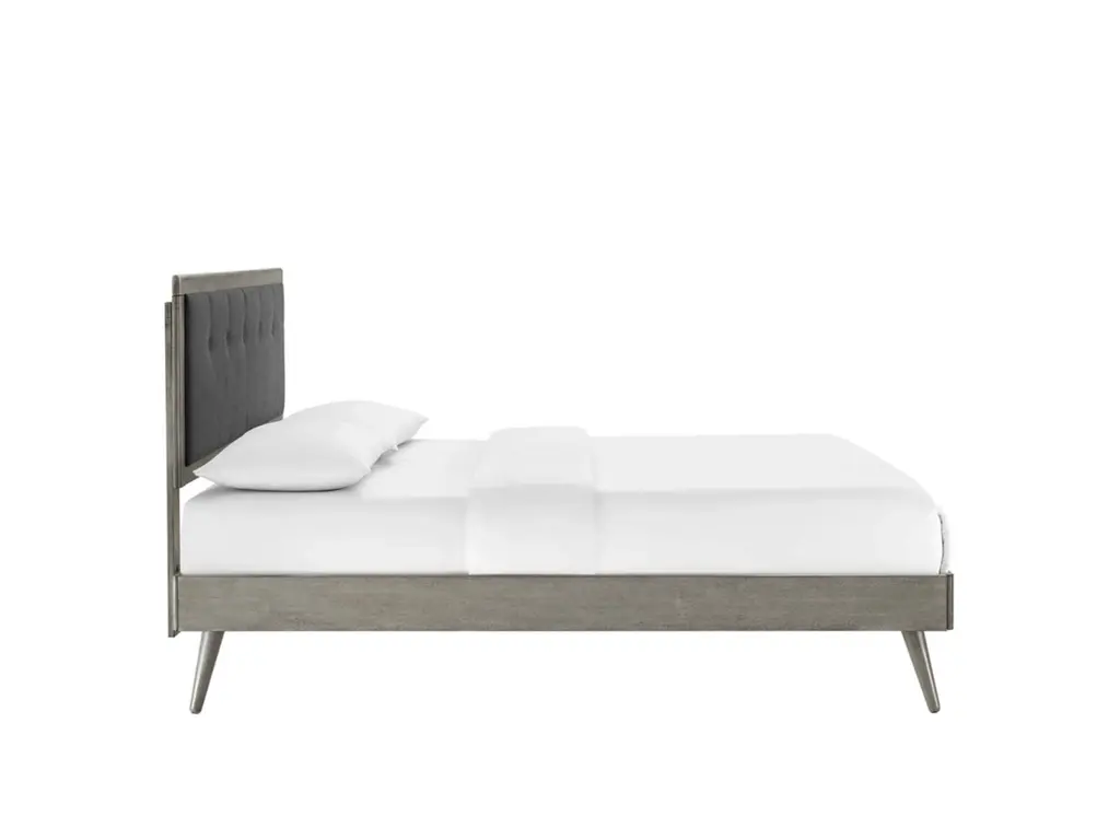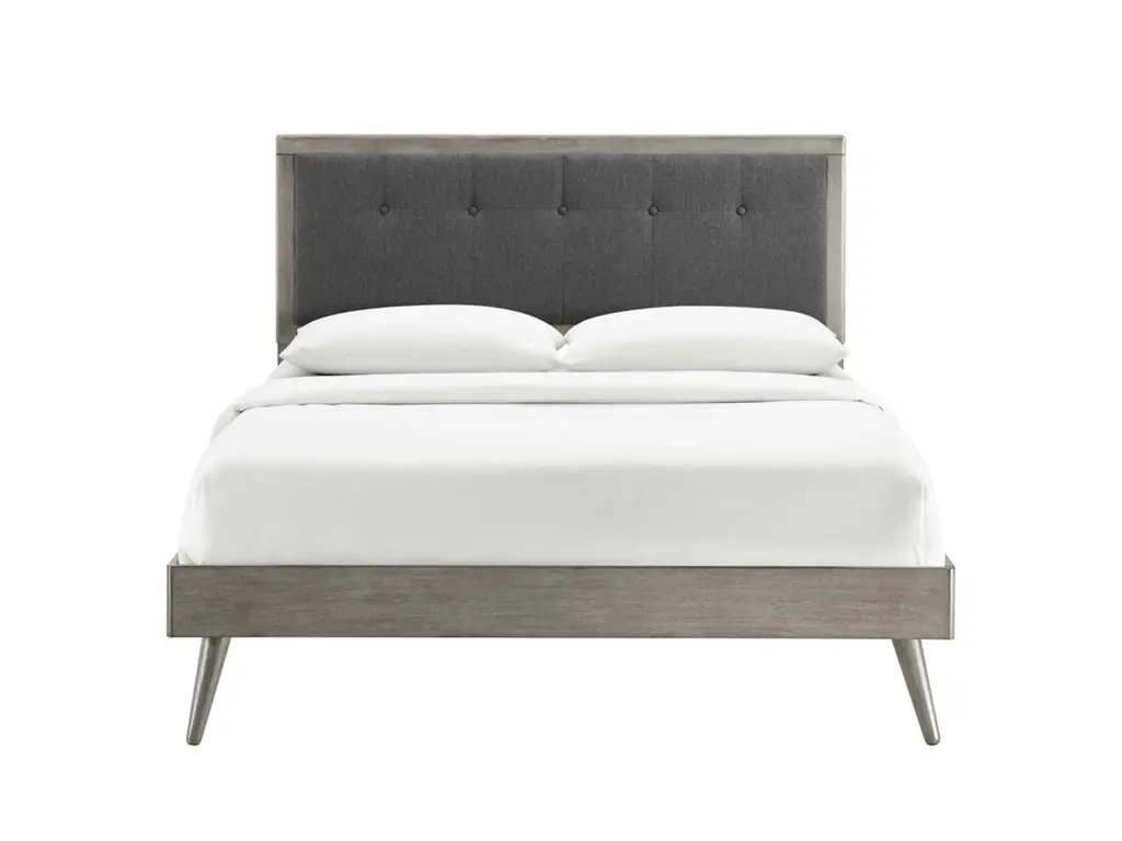 Refresh your master bedroom or guest room with the modern style, retro detail, and organic aesthetics of the Willow Tufted Wood Queen Platform Bed. Inspired by mid-century style, the upholstered headboard of this queen bed frame features a beautiful wood frame that encases a button tufted design. This platform bed frame is a sturdy addition to the bedroom with a durable wood, MDF, and veneer construction and splayed rubberwood legs. Eliminating the need for a box spring, this queen bed is complete with a wood slat support system, reinforced center beam, and supporting legs that make it a lasting mattress foundation for memory foam, latex, innerspring, and hybrid mattresses. Assembly required. Queen bed frame weight capacity: 601 lbs.