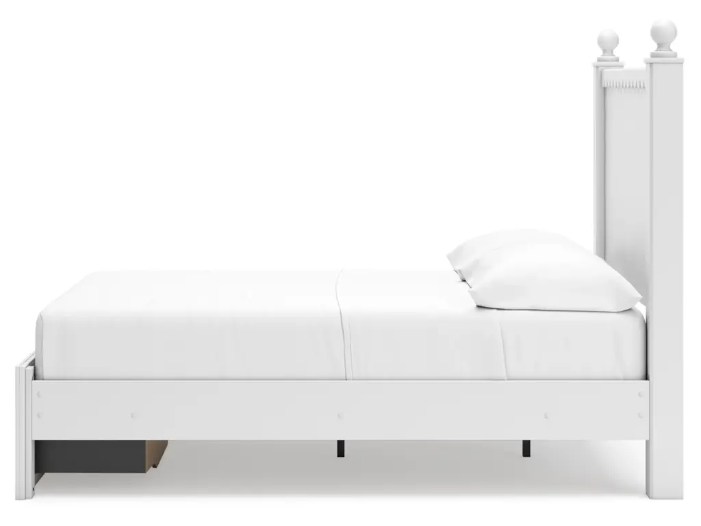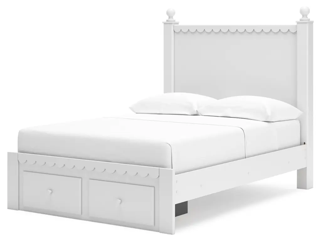 Make morning or bedtime that much more magical with the Mollviney full panel storage bed. Charmingly cute with its scalloped detailing, it appeals to both her sense of playful whimsy and your love for modern design. Drawers in the footboard provide handy storage for clothes, toys and anything in between. And the bed's crisp white finish gives you the versatility to pair it with existing decor.