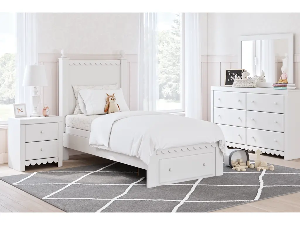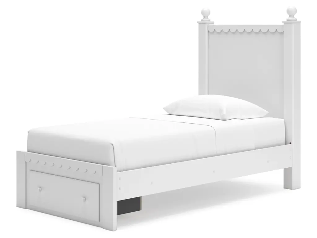 Make morning or bedtime that much more magical with the Mollviney panel storage bed. Charmingly cute with its scalloped detailing, it appeals to both her sense of playful whimsy and your love for modern design. Drawers in the footboard provide handy storage for clothes, toys and anything in between. And the bed's crisp white finish gives you the versatility to pair it with existing decor.
