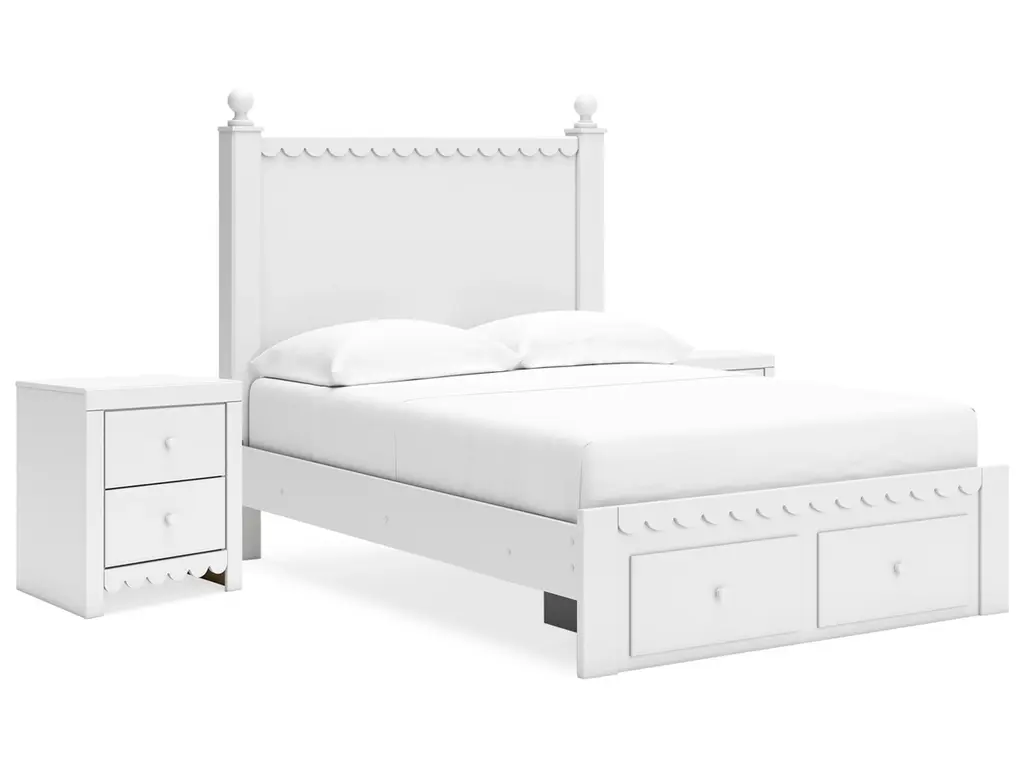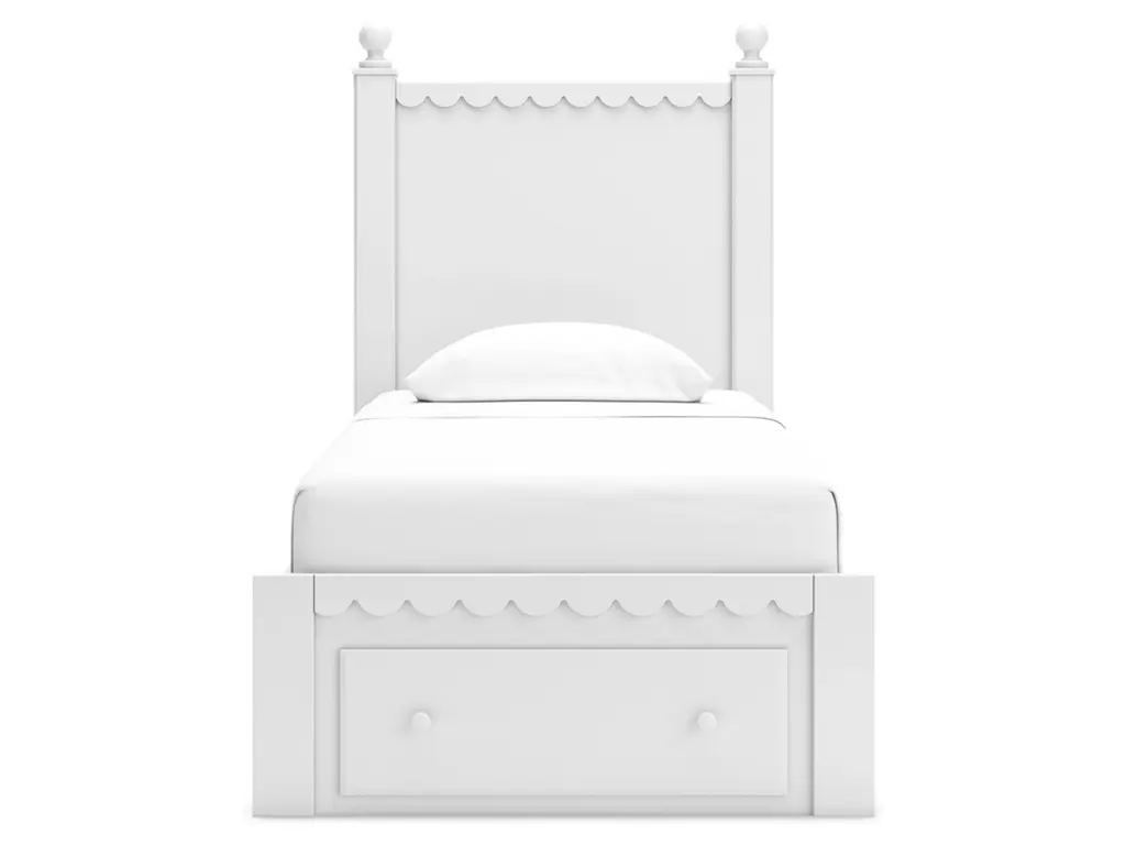 Make morning or bedtime that much more magical with the Mollviney twin panel storage bed. Charmingly cute with its scalloped detailing, it appeals to both her sense of playful whimsy and your love for modern design. Drawers in the footboard provide handy storage for clothes, toys and anything in between. And the bed's crisp white finish gives you the versatility to pair it with existing decor.