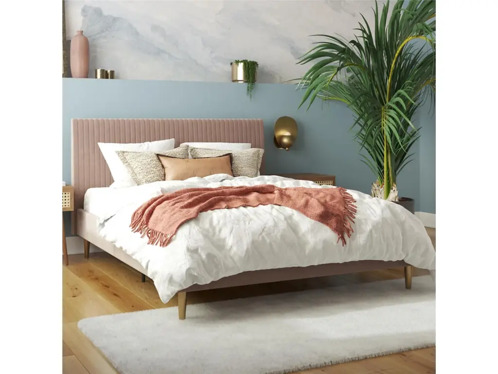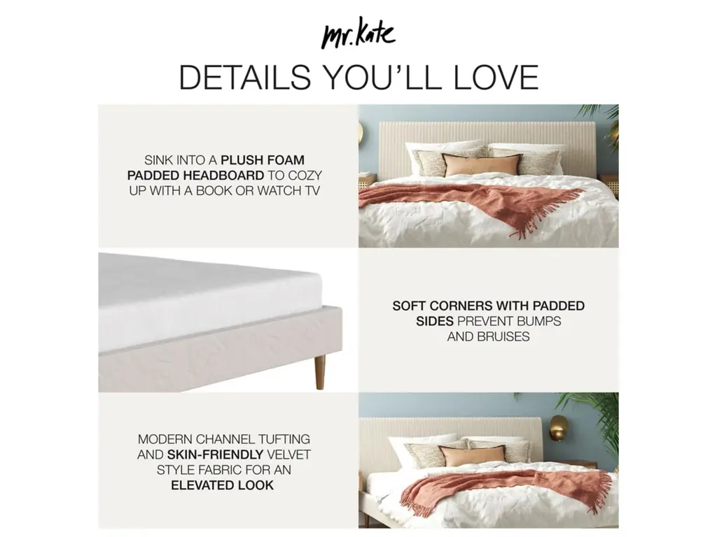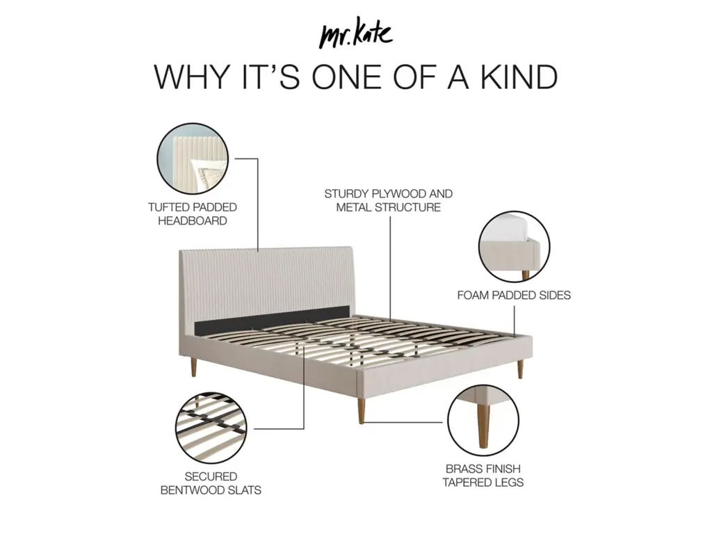 The Mr. Kate Daphne Bed doesn't take itself too seriously but it also doesn't mind being the center of attention. With its richly hued soft-to-the-touch upholstery, detailed vertical channel-tufted headboard, and brass toned tapered metal legs, the Daphne sets the stage for a memorable design experience. It combines its ultra-luxe sensibilities with a serene slim line profile that is bound to maximize the look of any tightly spaced bedroom. Sleep in comfortable bliss knowing that the Daphne has been well-built with a sturdy wooden frame that features a secured bentwood slat system, metal side rails and strong center legs. Offered in a number of opulent shades, the Daphne will serve as an anchor piece, confident enough to allow your indulgence in those DIY passion projects that will completely transform your room from bland to modern day glam. So start sprinkling some of that fairy dust! Not sure how to define your style? Take the Mr. Kate "What's My Aesthetic?" Quiz!