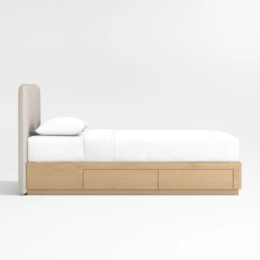 Our Noa Bed with Storage Base sets a beautiful foundation for a room that can grow with your child. Between its understated cream upholstery and warm oak base, the bed has a breezy versatility that works with any decor. Two under-bed drawers make it a practical space-saver, while the cushy, softly textured upholstery gives it a cozy feel that kids of all ages will love.