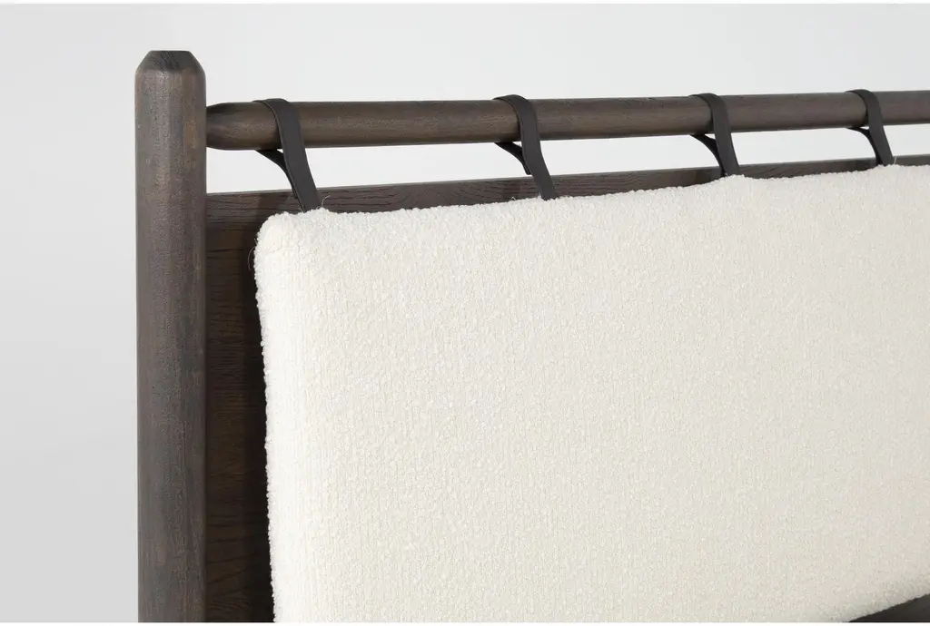 With its modern farmhouse look that combines elements of old and new, our Nomad bedroom set revives the charm of discovered antiques and found objects for today's interiors. A combination of solid oak and oak veneer in a multi-step warm brown finish gives each design rich, distinctive appeal. While custom hammered metal hardware adds industrial detail, gracefully turned posts lend an air of elegance. The bed gets a touch of texture with a removable headboard cushion in on-trend boucle, and the nightstand includes USB ports for easy, convenient charging.