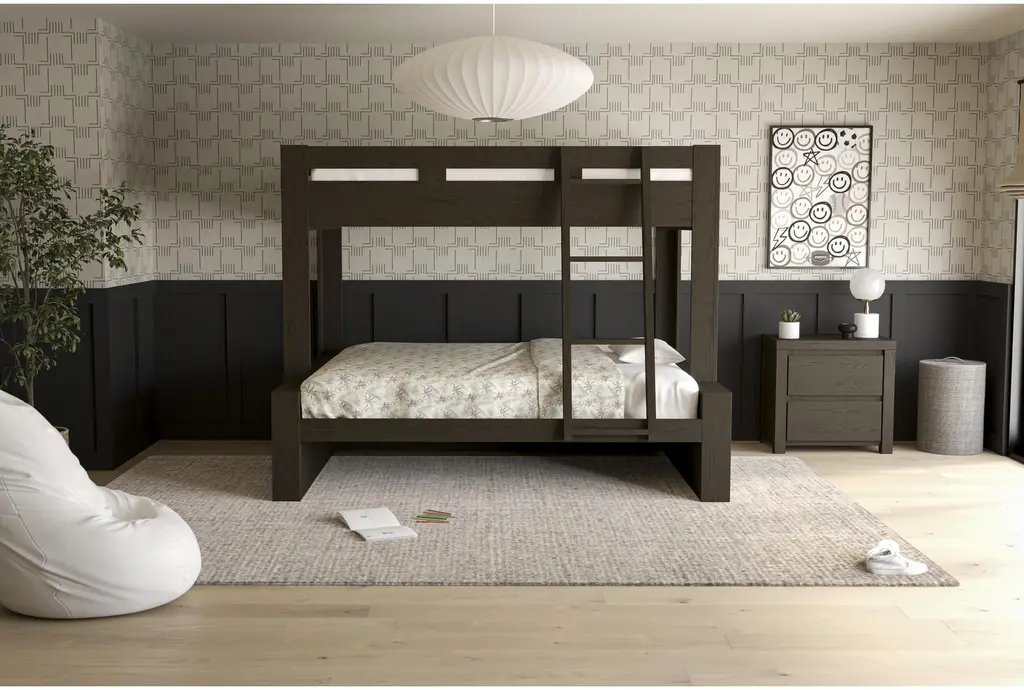 Introducing the Nora Brown Wood Twin Over Full Bunk Bed With Ladder, perfect for kids' rooms with a casual style. This versatile bunk bed combines functionality with a sleek design, making it ideal for small spaces. The sturdy wood construction ensures durability while providing a warm, rustic charm to any bedroom.