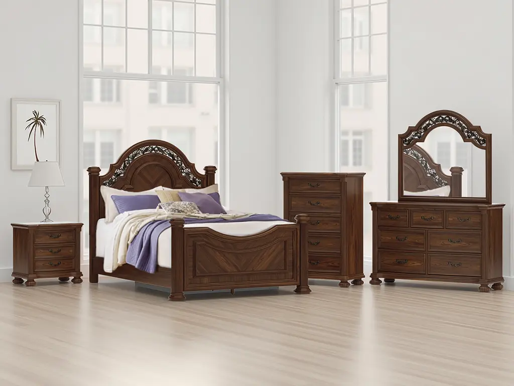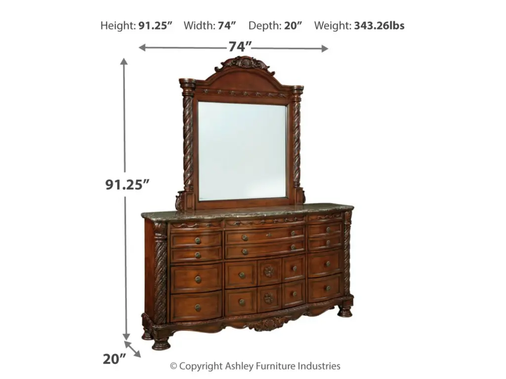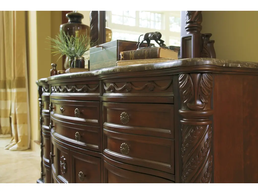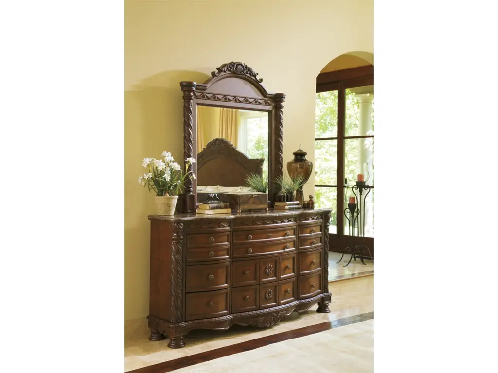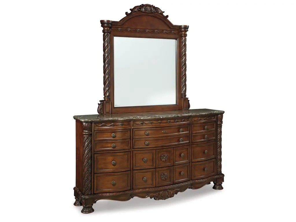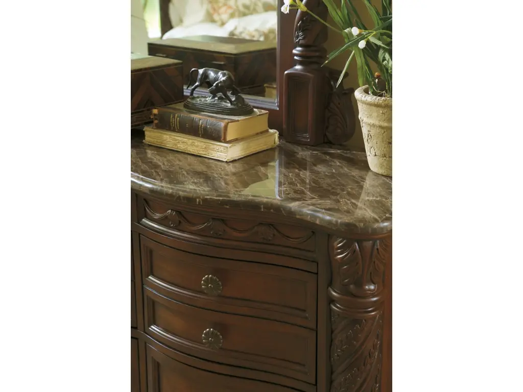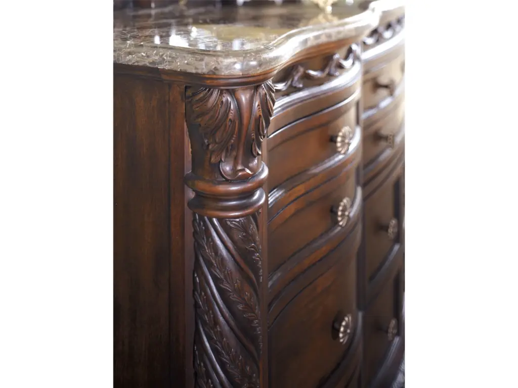Inspired by the grandeur and grace of Old World traditional style, the North Shore bedroom set is nothing short of stunning. A choice blend of materials is accented with detailed ornamental appliques. Large-scale decorative pilasters make a grand stance.